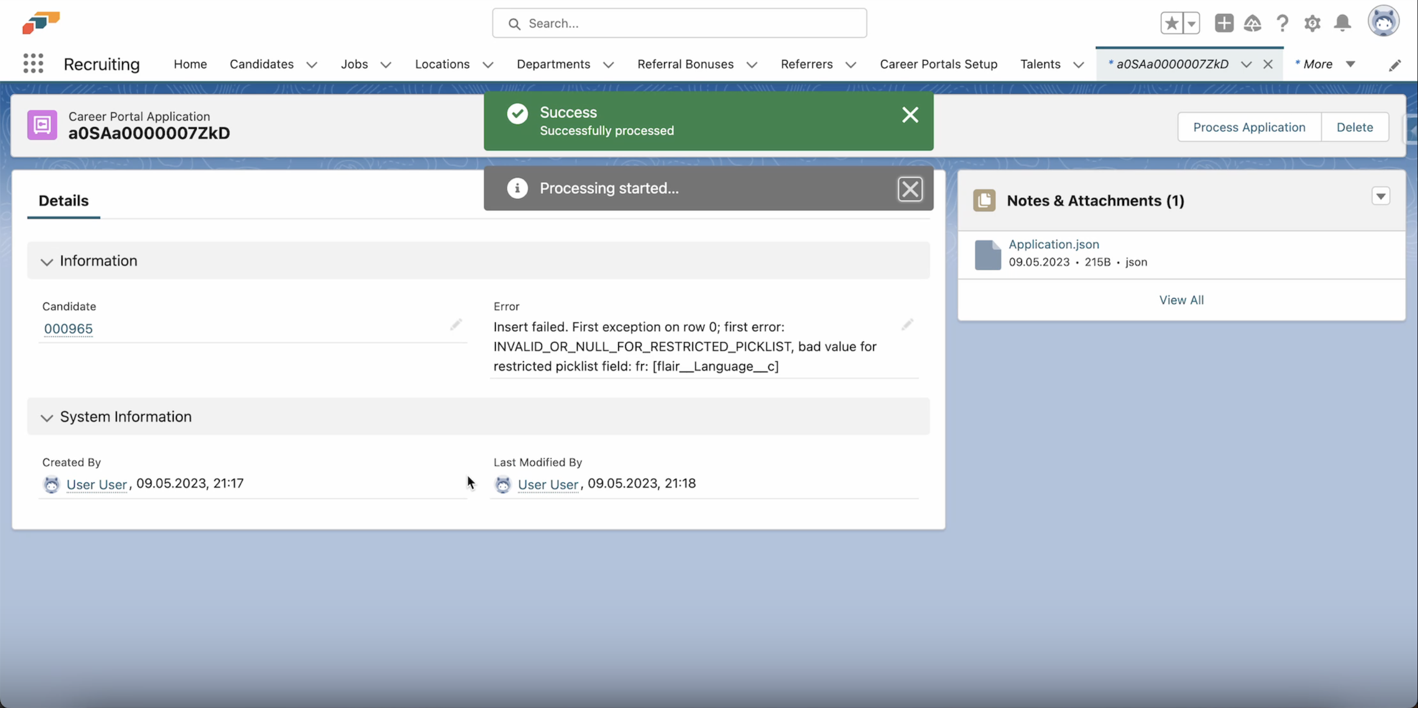 Klicken Sie einfach auf Activate, um dieses Feld zu reaktivieren, und kehren Sie dann zur fehlerhaften Bewerbung auf der Seite Career Portal Applications zurück. Nachdem Sie den Fehler behoben haben, können Sie auf die Schaltfläche Process Application klicken. Dies sollte die Bewerbung erfolgreich verarbeiten und einen Kandidaten in Ihrer flair Recruiting-App erstellen.