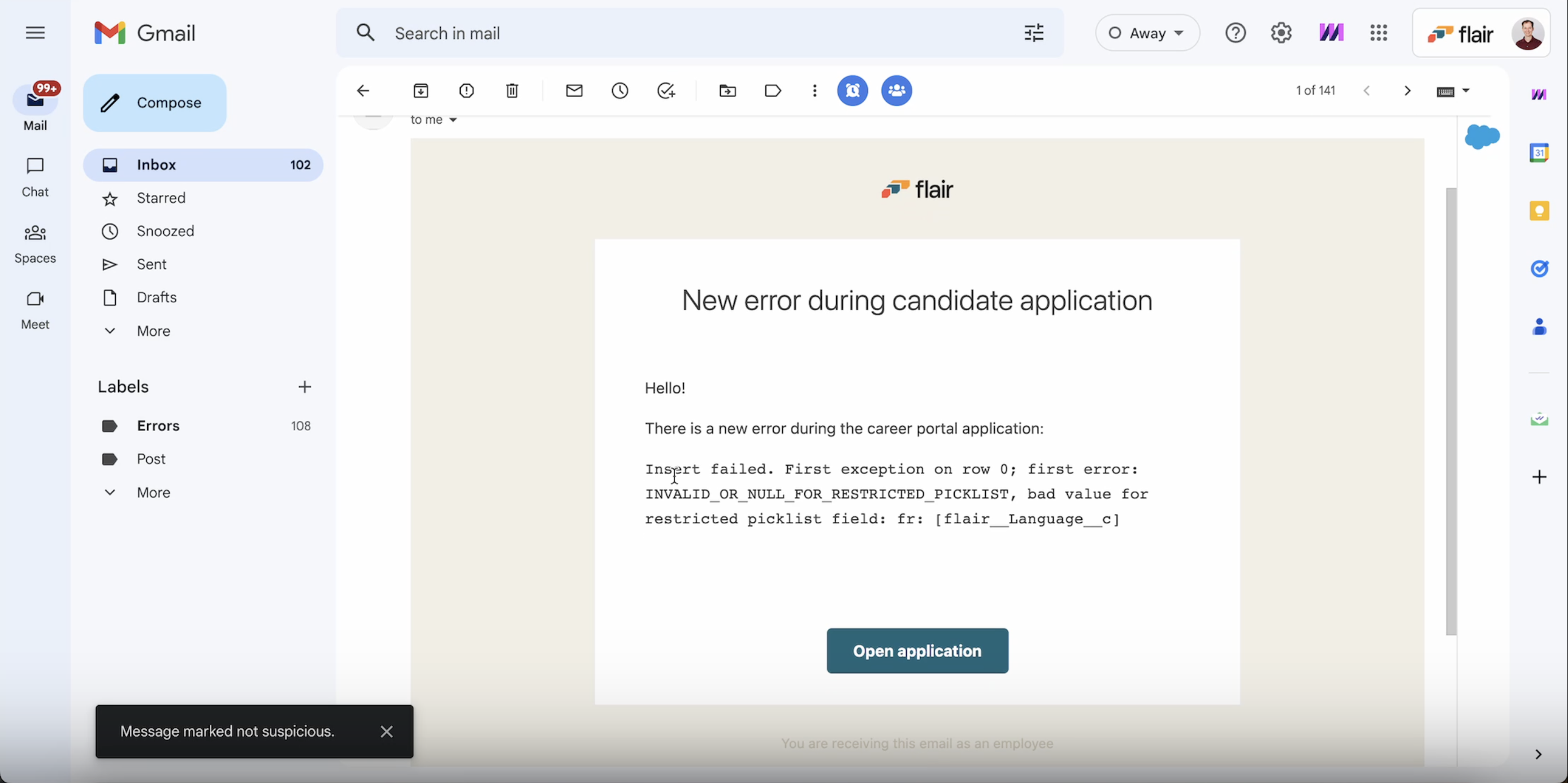 Im obigen Beispiel enthielt die Bewerbung einen ungültigen Wert für eine eingeschränkte Auswahlliste namens flair__Language__c. Dies ist möglicherweise auf Änderungen an der Auswahlliste oder den verfügbaren Optionen eines Felds zurückzuführen, wodurch der Kandidat eine Option ausgewählt hat, die nicht mehr gültig ist.