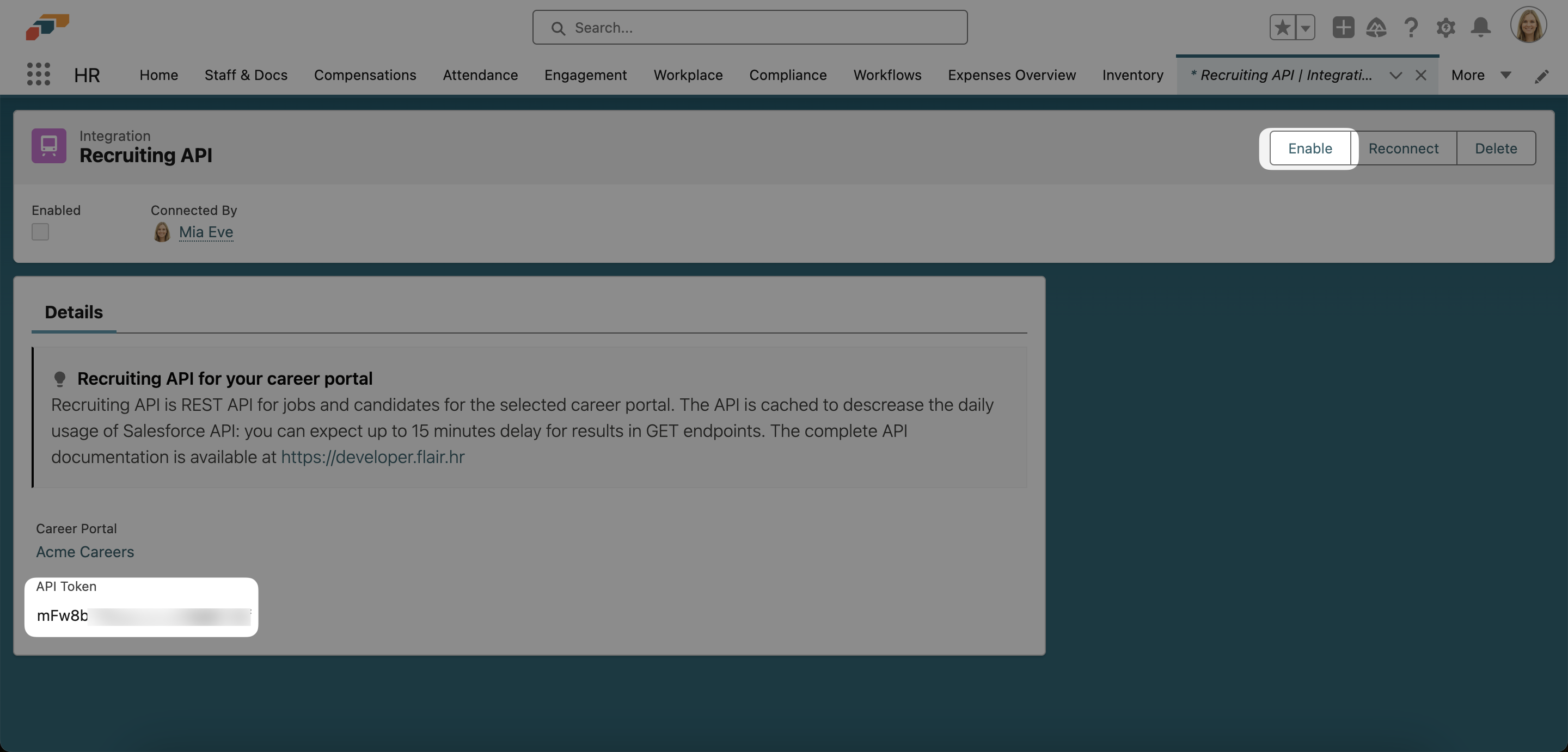 - Sie werden zu einer neuen Recruiting API-Seite weitergeleitet. Klicken Sie auf Enable und kopieren Sie dann das API Token unten auf der Seite.