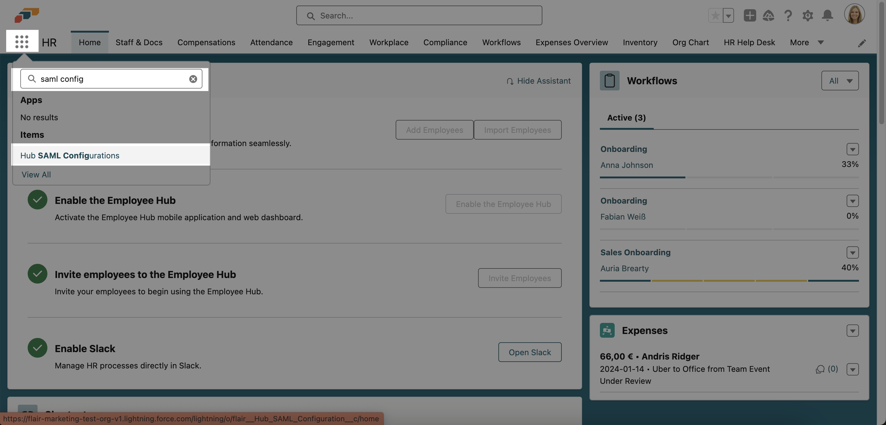 - Öffnen Sie in der flair HR-App den App Launcher 𓃑 und suchen Sie nach Hub SAML Configurations.