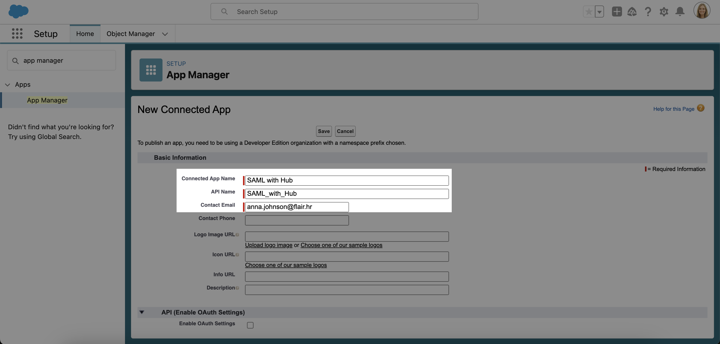 - Geben Sie Ihrer App einen Namen, z. B. SAML With Hub. Dieser Name wird automatisch verwendet, um das Feld API Name auszufüllen. Geben Sie eine Contact Email-Adresse ein.