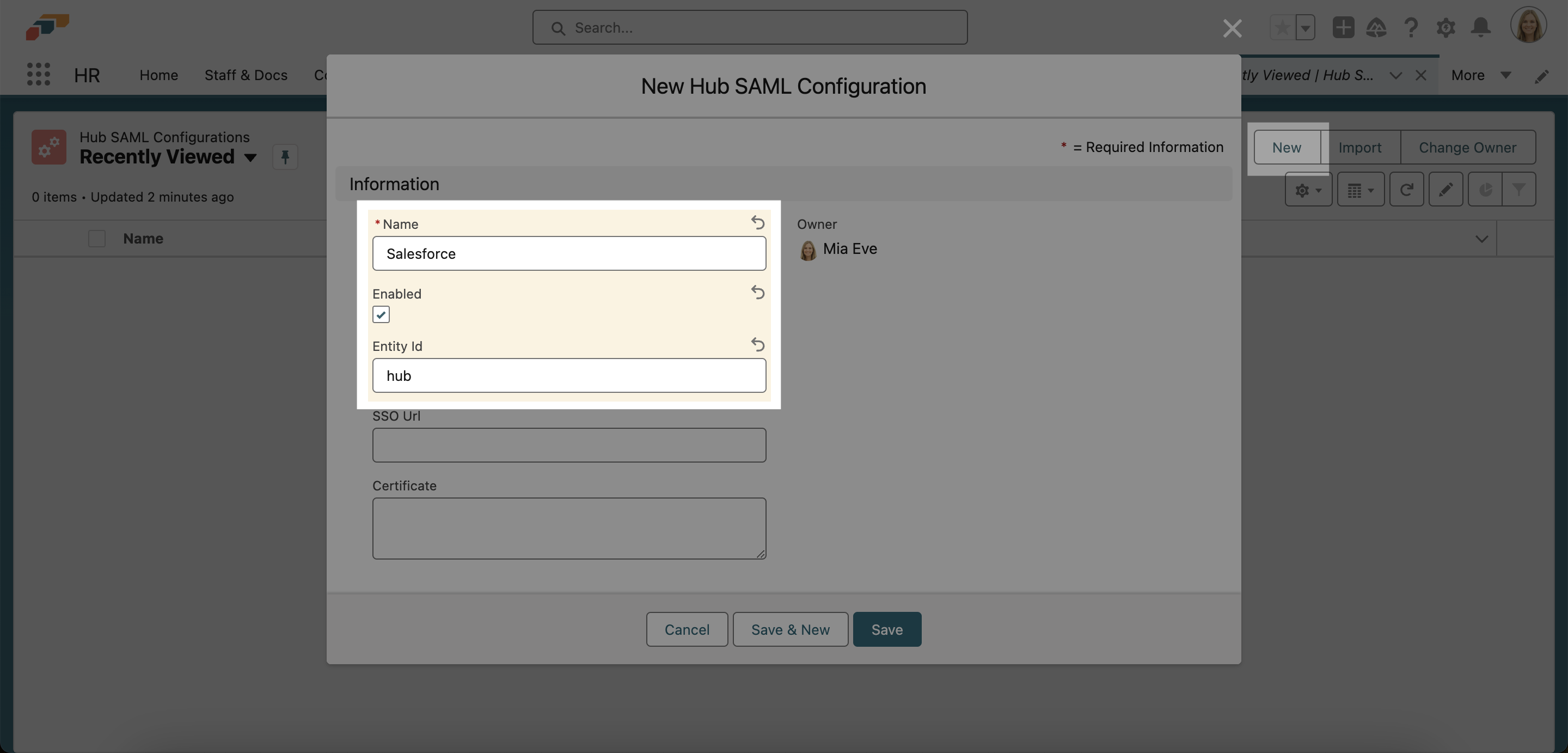 a) Geben Sie Ihrer SAML-Konfiguration einen Namen, z. B. Salesforce.