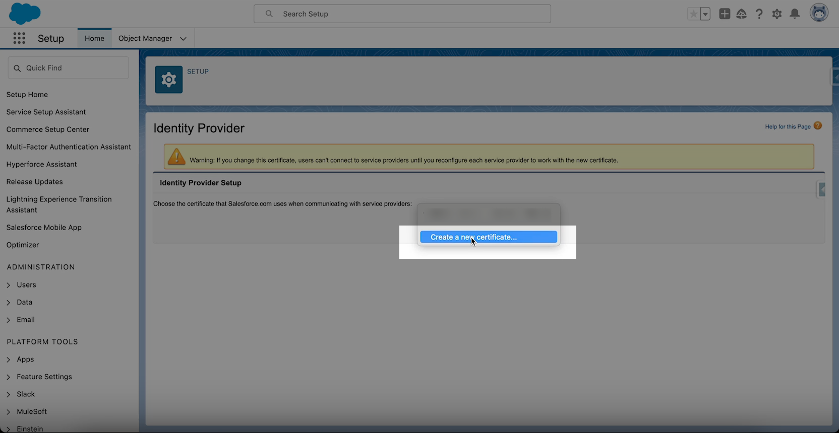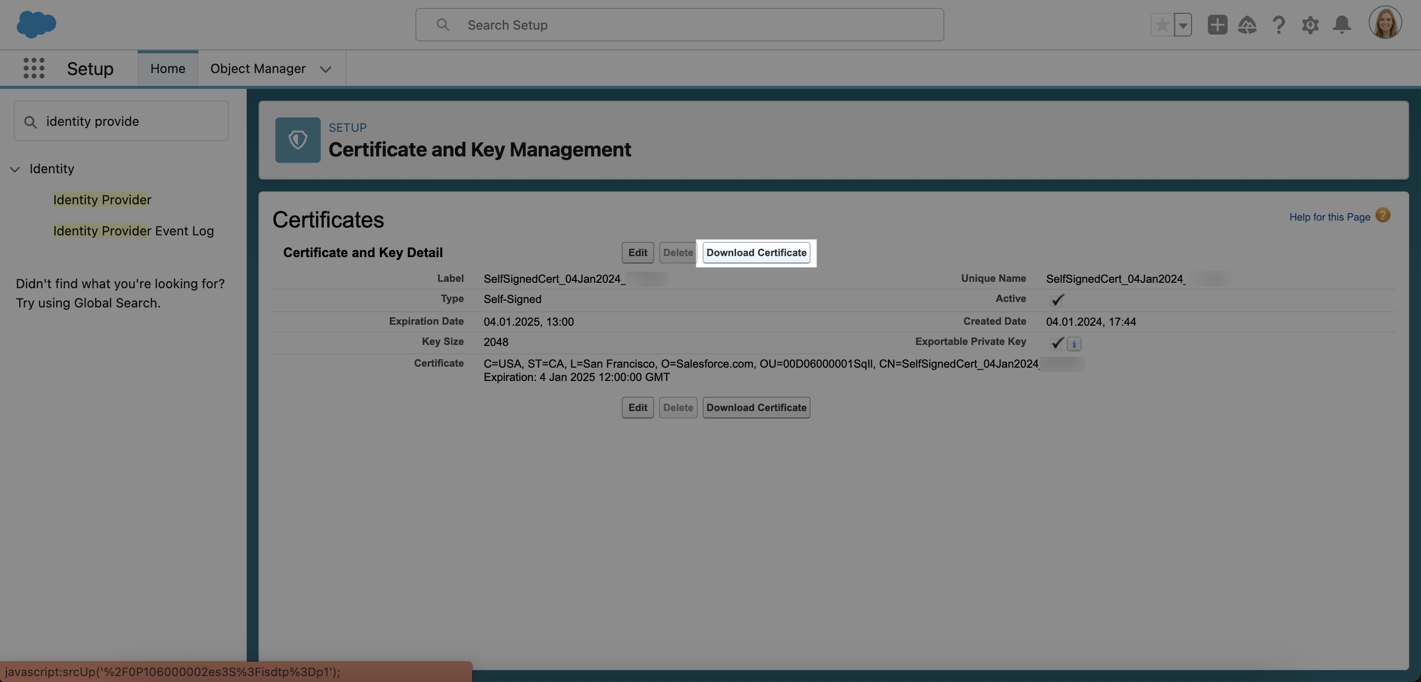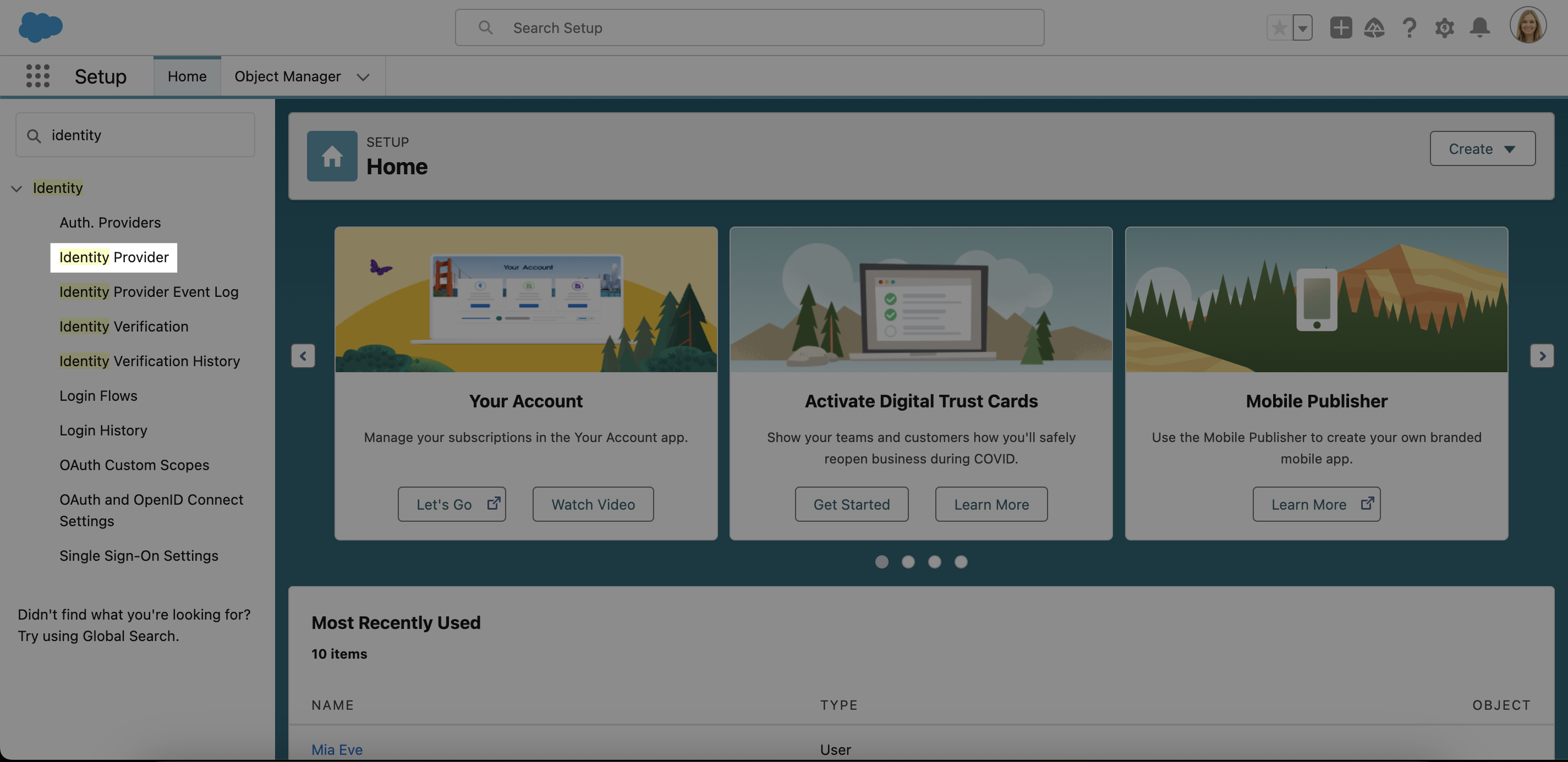 - Öffnen Sie das Salesforce Setup und verwenden Sie die Suchleiste im linken Menü, um Identity Provider zu finden.