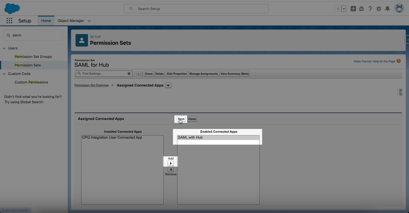 - Wählen Sie das SAML-Permission Set aus, das Sie zuvor erstellt haben, fügen Sie es zu Enabled Permission Sets hinzu und klicken Sie dann auf Save.