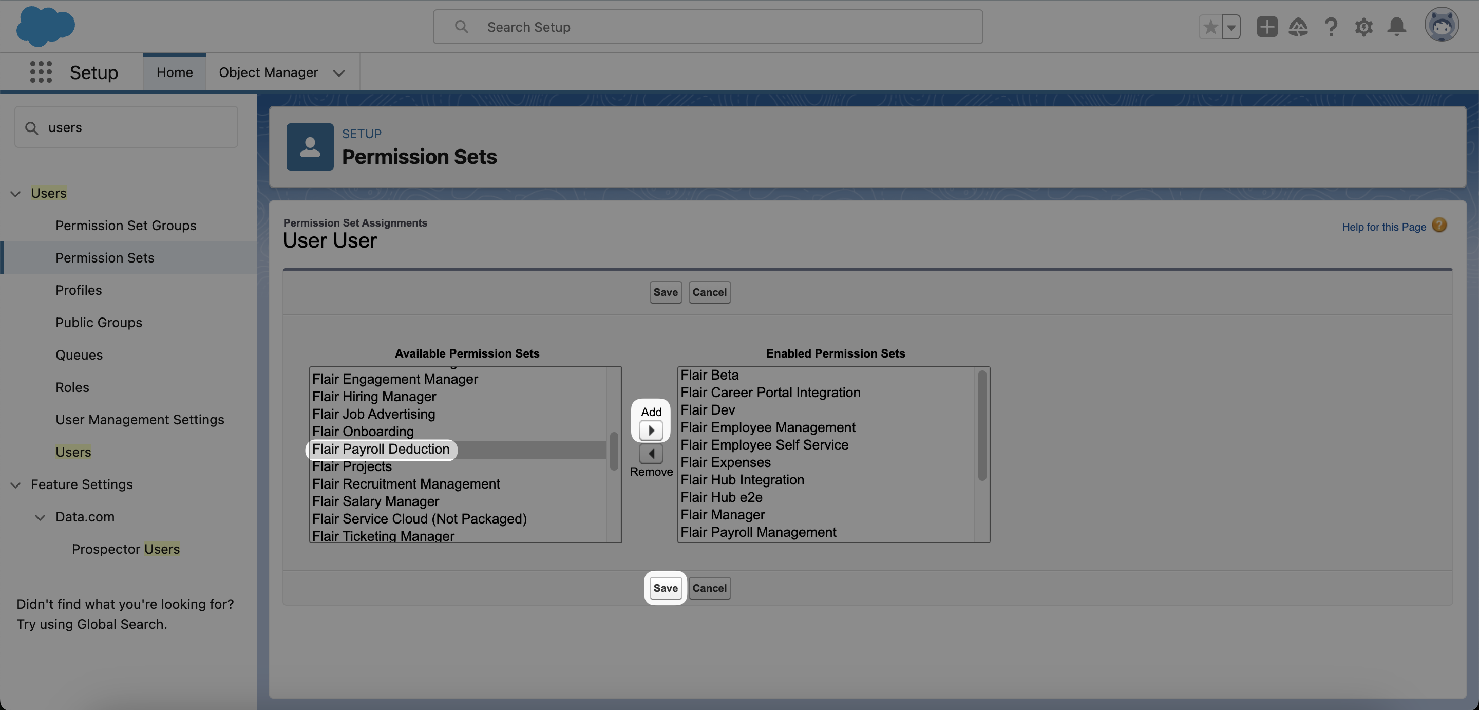 flair.Can Update Locked Payroll Runaus der Liste Available Custom Permissions aus und klicken Sie auf Add, um sie in die Liste Enabled Custom Permissions zu verschieben. Klicken Sie dann auf Save.