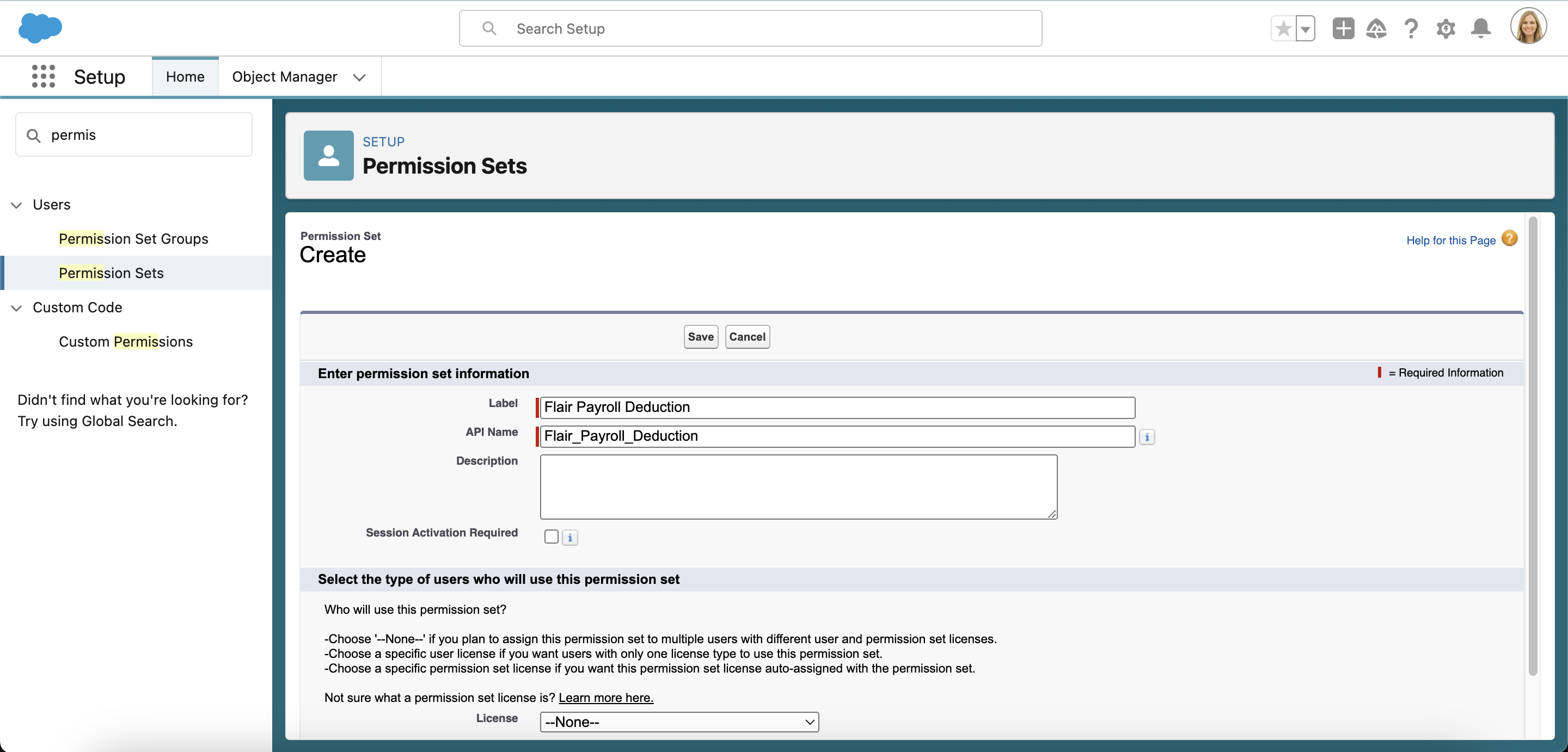 - Geben Sie Ihrem Permission Set im Feld Label einen Namen, z. B. Flair Payroll Deduction. Lassen Sie das Feld API Name unverändert und klicken Sie auf Save.