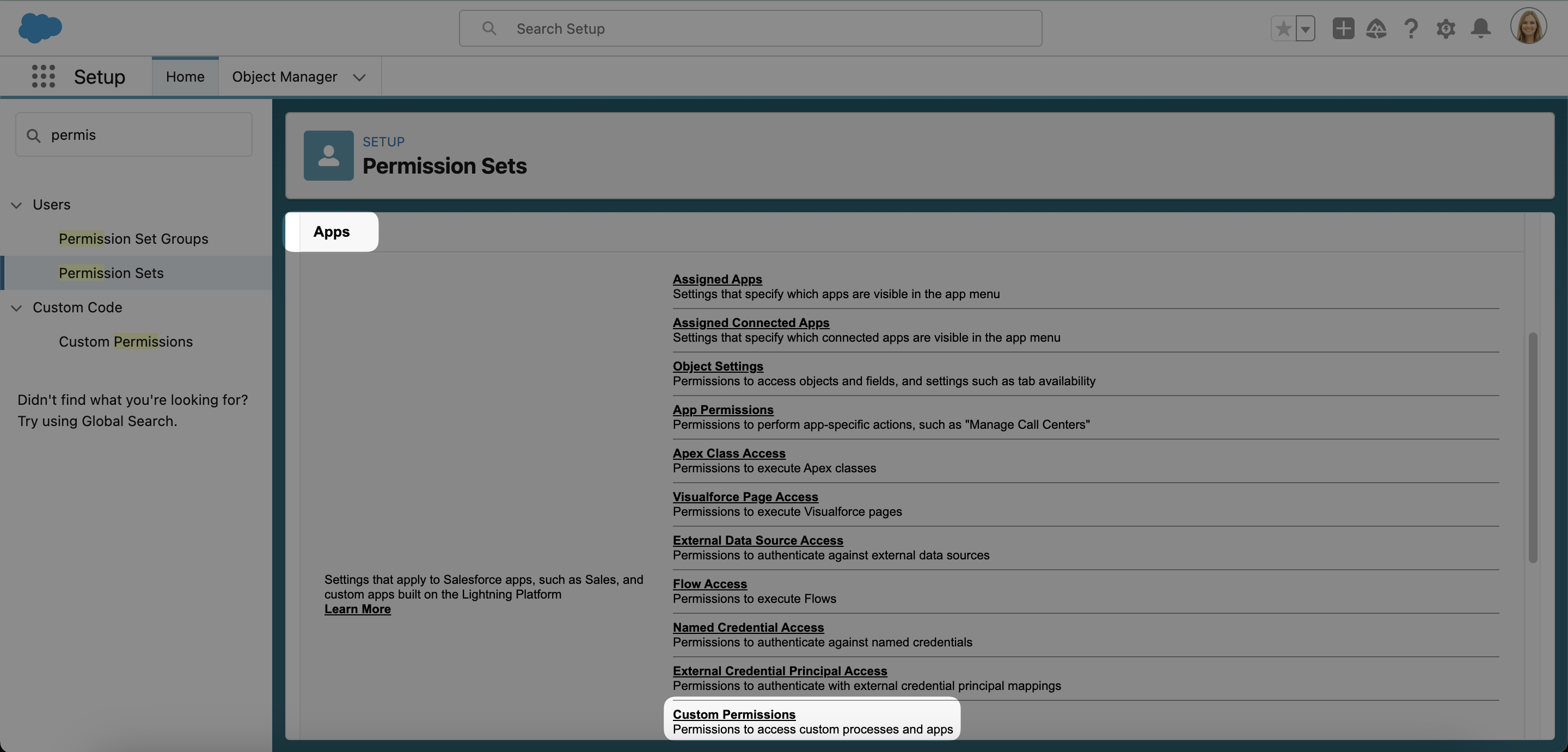 - Klicken Sie anschließend im Bereich Apps auf Custom Permissions.