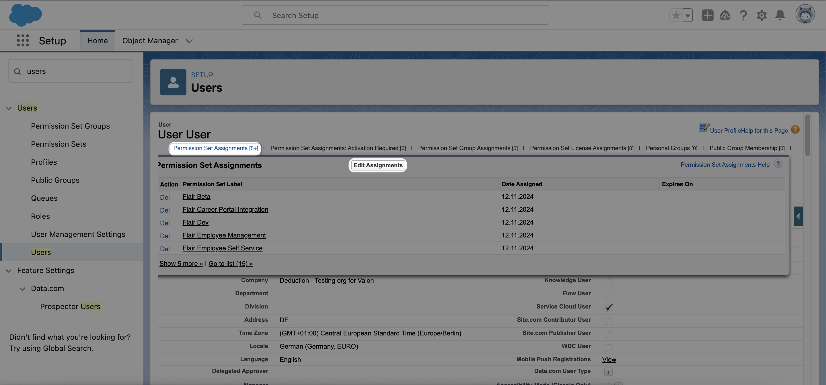 - Bewegen Sie den Mauszeiger über den Bereich Permission Set Assignments und klicken Sie dann im erscheinenden Popup auf die Schaltfläche Edit Assignment.