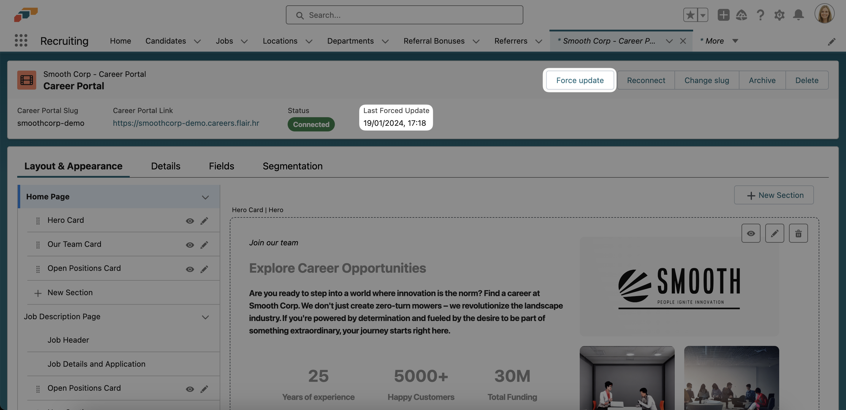 Wenn Sie feststellen, dass Änderungen, die Sie an Ihrem Karriereportal vorgenommen haben, nicht angezeigt werden, klicken Sie einfach auf die Schaltfläche Force Update in der Kopfzeile Ihrer Career Portal Setup-Seite. Dadurch wird der Cache geleert, sodass Sie Ihre Änderungen sofort live sehen können.