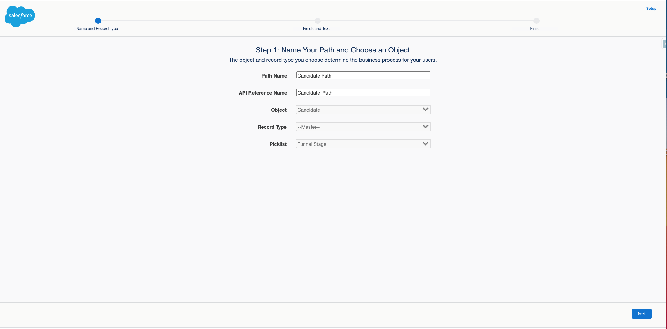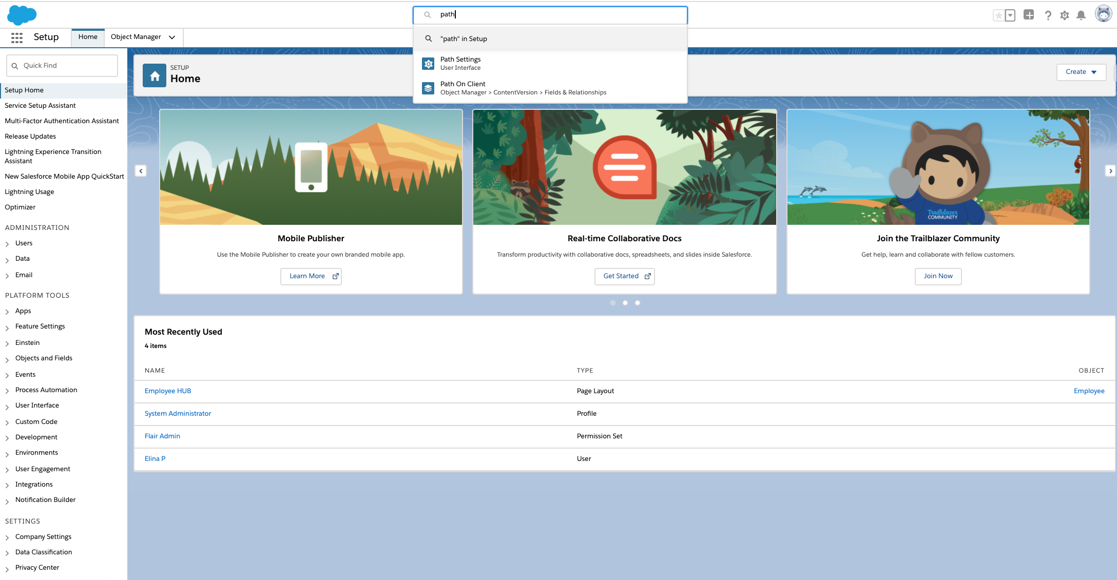Geben Sie im Salesforce Setup Path Settings in die Suchleiste ein. Sie finden diese Seite auch unter Platform Tools > User Interface > Path Settings in der Navigationsleiste im Setup.