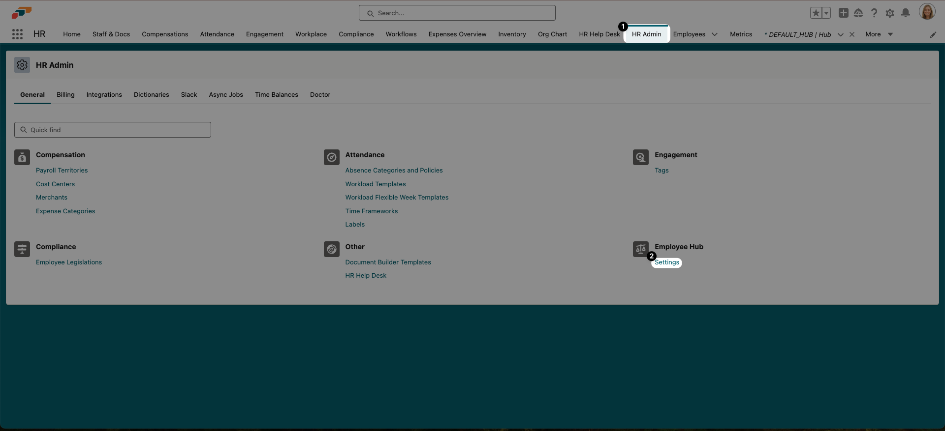 - Öffnen Sie die Seite HR Admin in der flair-App auf Salesforce. Sie finden HR Admin in Ihrer Navigationsleiste oder über den Salesforce App Launcher 𓃑.