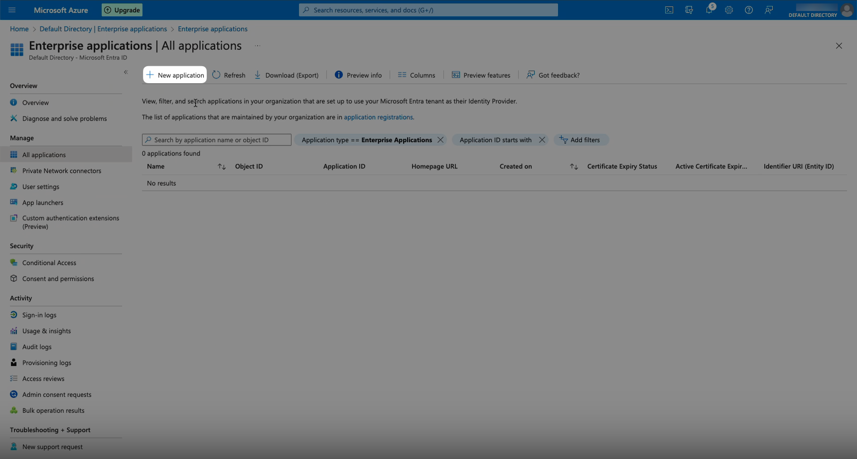 - Wählen Sie Enterprise Applications aus dem linken Menü und klicken Sie dann auf New Application in den Tabs oben auf dem Bildschirm.
