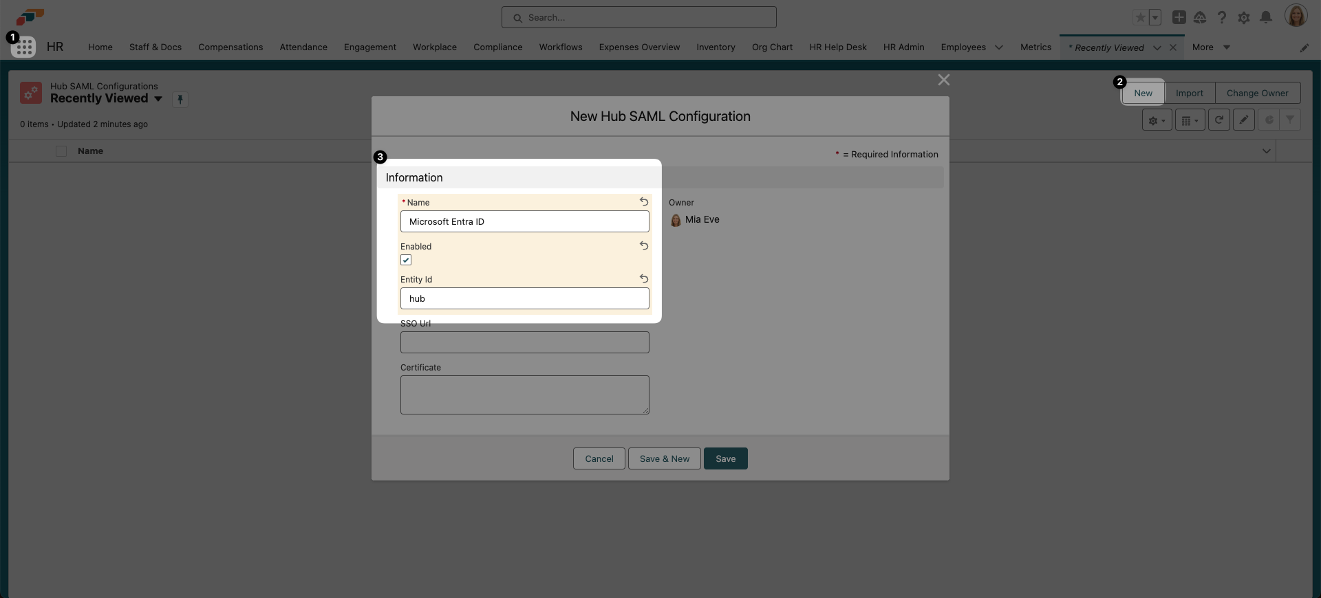Gehen Sie nun zurück zur flair-App auf Salesforce und verwenden Sie den App Launcher 𓃑, um die Seite Hub SAML Configurations zu finden. Klicken Sie auf New und füllen Sie die Felder aus.