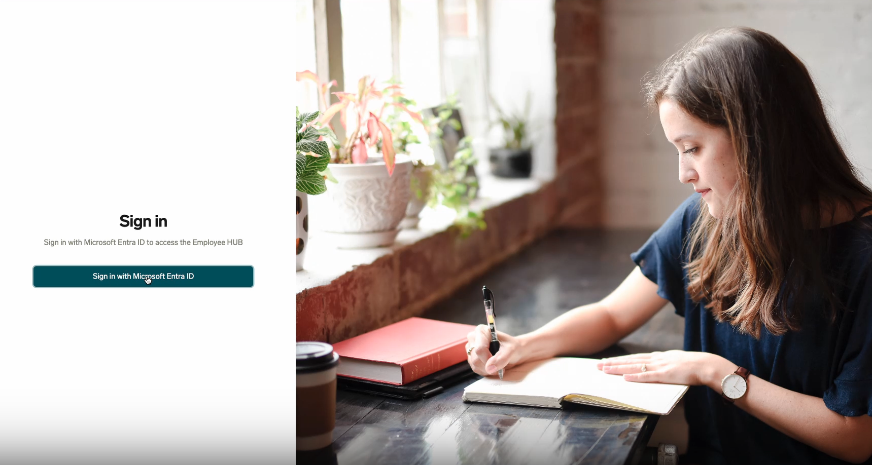 - Dies leitet Sie zum Anmeldebildschirm des Employee Hub weiter. Klicken Sie auf „Sign in with Microsoft Entra ID“. Sie können dann das Microsoft-Konto auswählen, mit dem Sie sich im Employee Hub anmelden möchten.