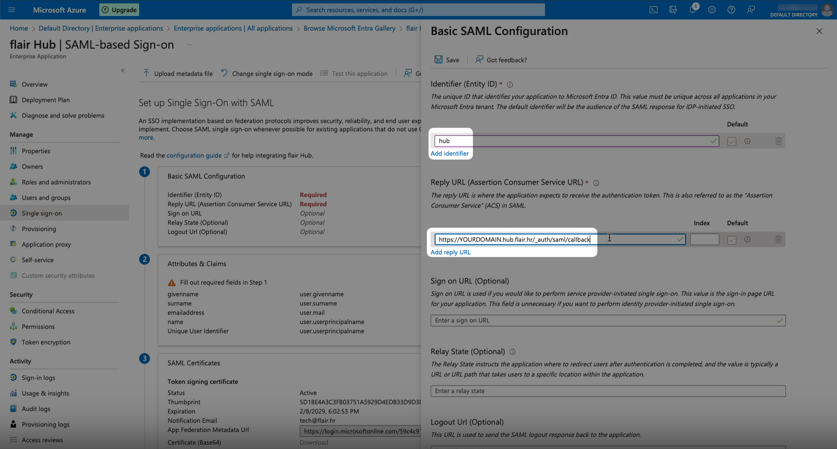 hub1,hub2oder andere eindeutige Werte, anstatt für alle Konfigurationenhubzu verwenden.https://IHREDOMAENE.hub.flair.hr/_auth/saml/callbackein (IHREDOMAENE sollte durch denselben Domänennamen ersetzt werden, den Sie in Schritt 2 dieses Leitfadens in den flair Employee Hub-Einstellungen eingegeben haben).
