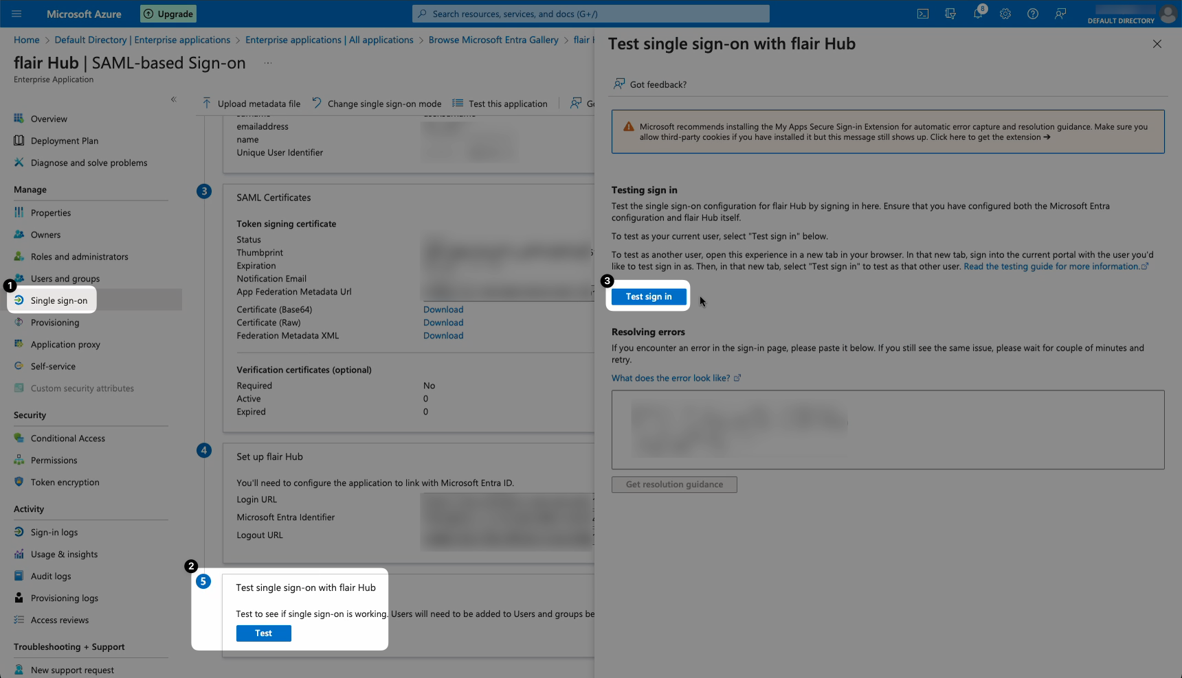 - Um schließlich Ihren SAML-Login zu testen, gehen Sie zurück zu Ihrer SAML-App in Microsoft Azure und öffnen Sie den Tab Single Sign-On aus dem linken Menü. Scrollen Sie nach unten zu Box 5 „Test single sign-on with flair Hub“ und klicken Sie auf Test. Klicken Sie dann auf Test Sign In.