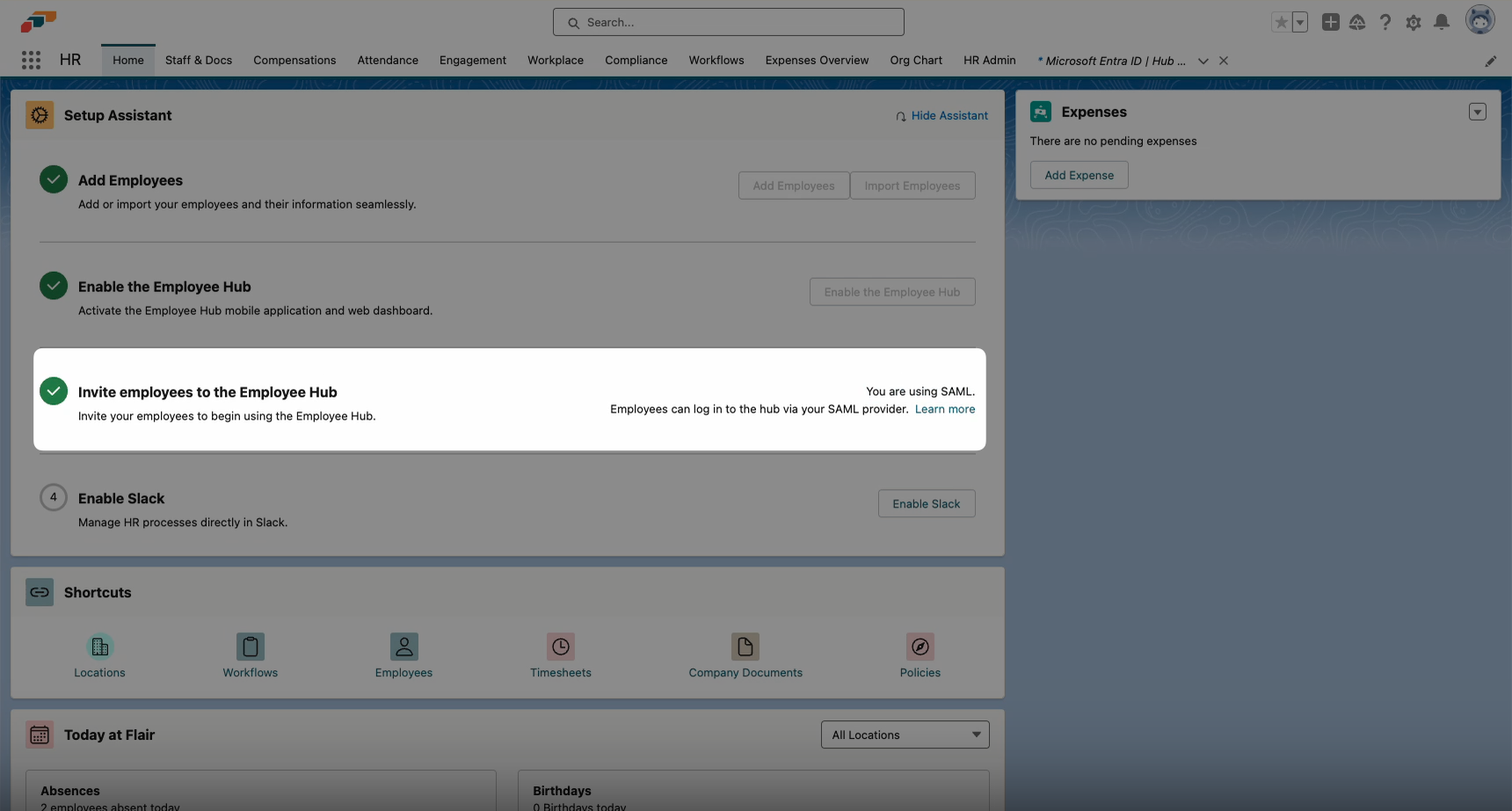 - Wenn Sie nun zur Startseite (Home) in der flair HR-App gehen, sehen Sie im Setup Assistant eine Meldung, die Sie darüber informiert, dass Sie SAML-Login verwenden.