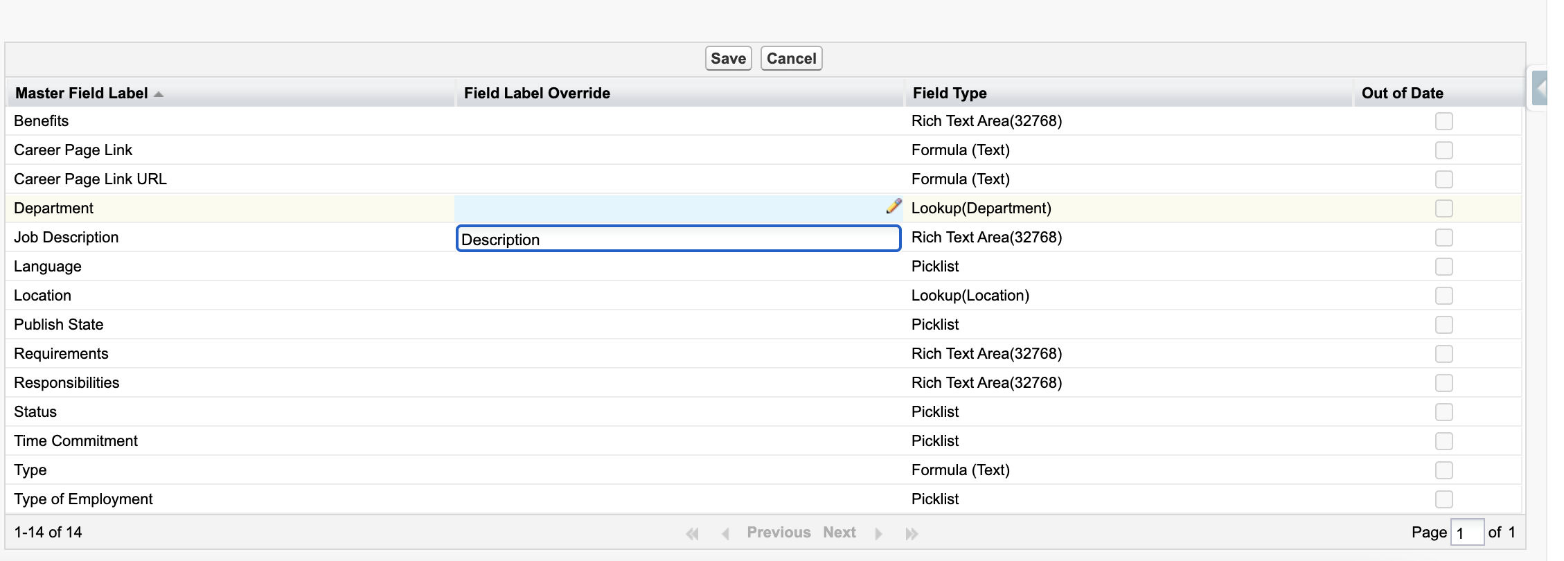 Unter Master Field Label finden Sie die Abschnitte Ihrer Karriereseite: Job Description, Responsibilities, Requirements und Benefits. Geben Sie Ihren neuen Wortlaut in die Spalte Field Label Override neben dem Abschnittsnamen ein, den Sie ändern möchten, und klicken Sie dann auf Save. In diesem Beispiel ändern wir Job Description in Description.