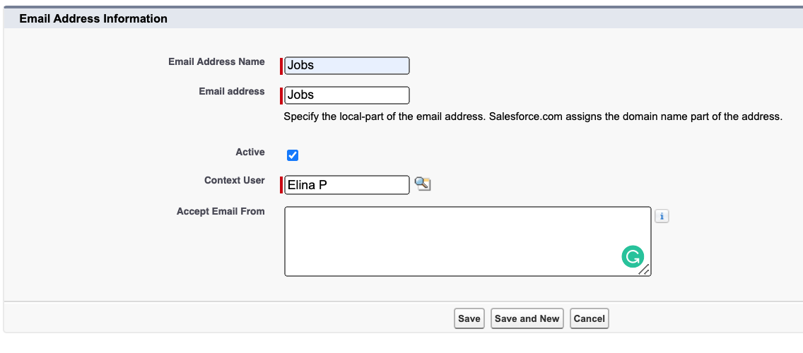 Definieren Sie Ihre E-Mail-Adresse, indem Sie das Feld Email Address ausfüllen. Das Wort, das Sie hier eingeben, erscheint vor dem @-Symbol in der E-Mail-Adresse. Wenn Sie beispielsweise ‚jobs‘ eingeben, beginnt die E-Mail-Adresse mit jobs@. Der Teil der E-Mail-Adresse nach dem @-Symbol wird automatisch von Salesforce generiert.
