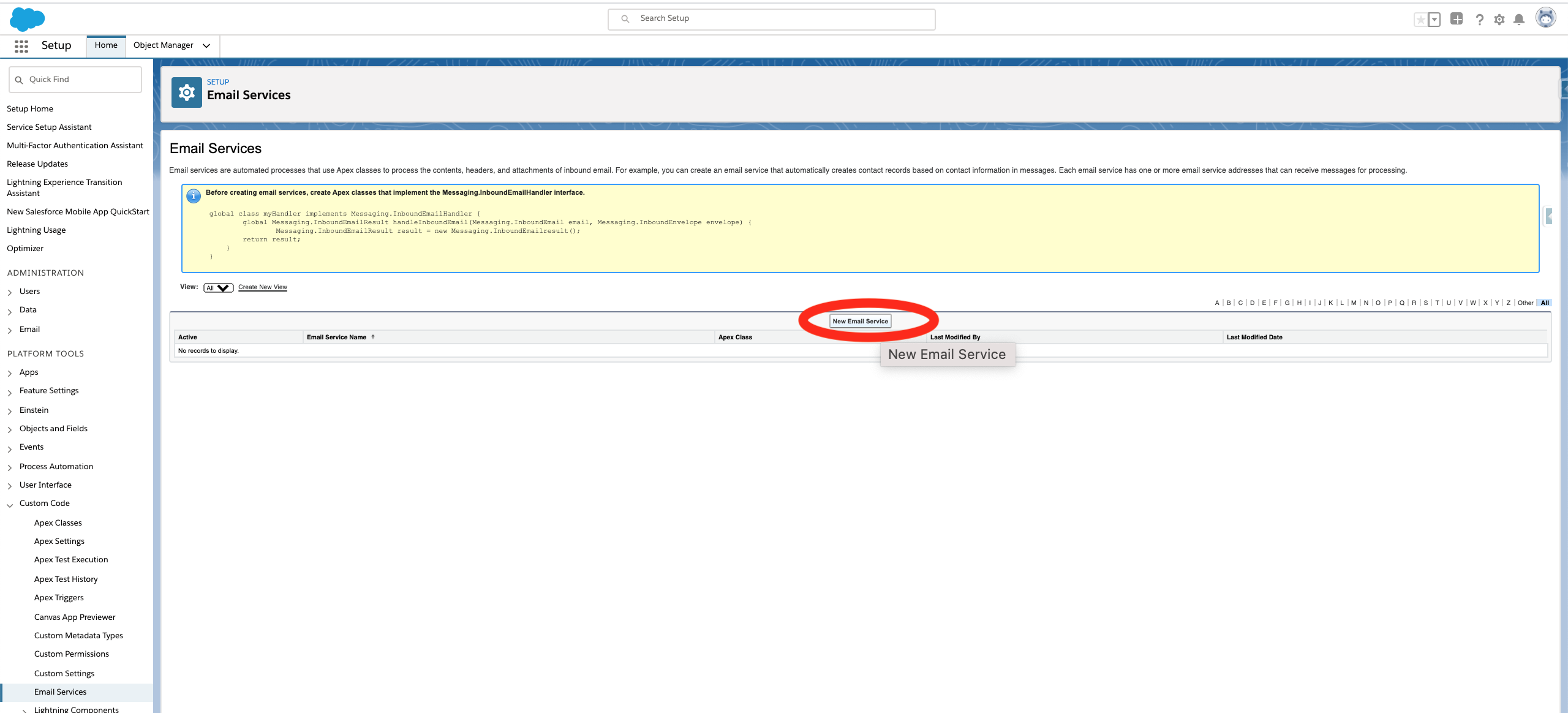 Suchen Sie im Salesforce Setup im Schnellsuche-Feld im linken Bereich nach Email Services.