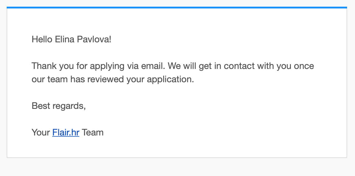 Mit flair können Sie automatisch eine E-Mail an Kandidaten senden, nachdem sie sich auf eine Stelle beworben haben, indem Sie Ihre E-Mail-Adresse verwenden.