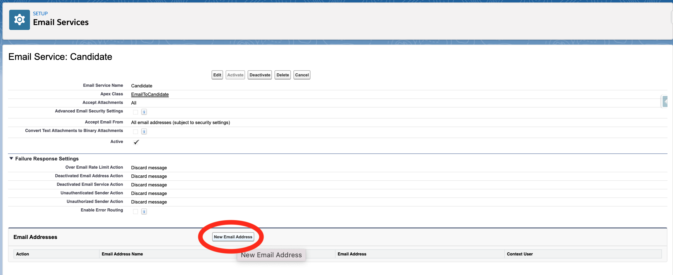 Sie werden auf eine neue Seite namens Email Service: Candidate weitergeleitet. Klicken Sie hier auf New Email Address.
