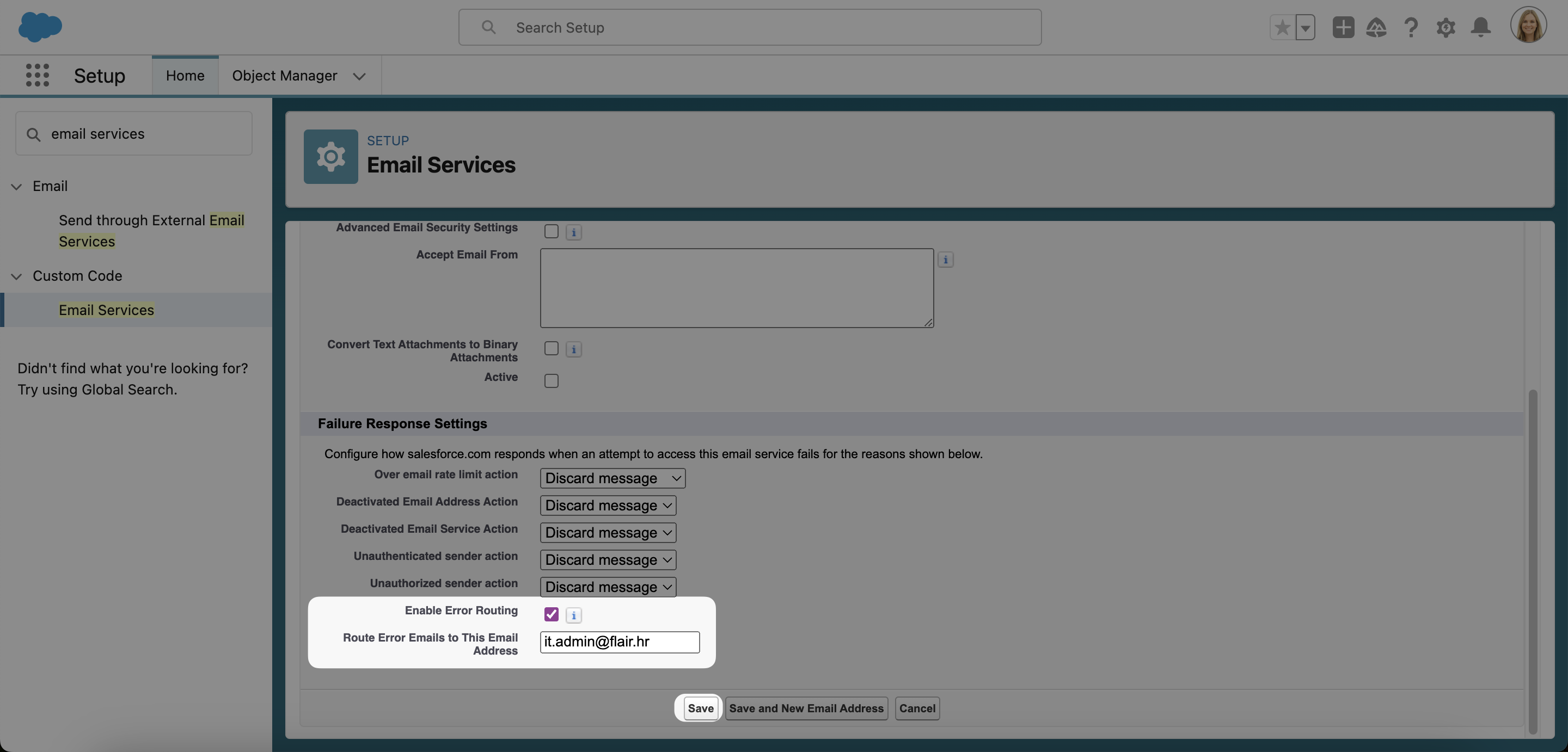 Wenn Sie Fehler-E-Mails an eine bestimmte Adresse weiterleiten möchten, aktivieren Sie das Kontrollkästchen Enable Error Routing und geben Sie Ihre gewählte E-Mail-Adresse ein. Wenn Sie das Fehler-Routing nicht aktivieren, werden die Fehlerbenachrichtigungs-E-Mails an die E-Mail-Adresse des Absenders gesendet. Wenn Sie fertig sind, klicken Sie auf Save.