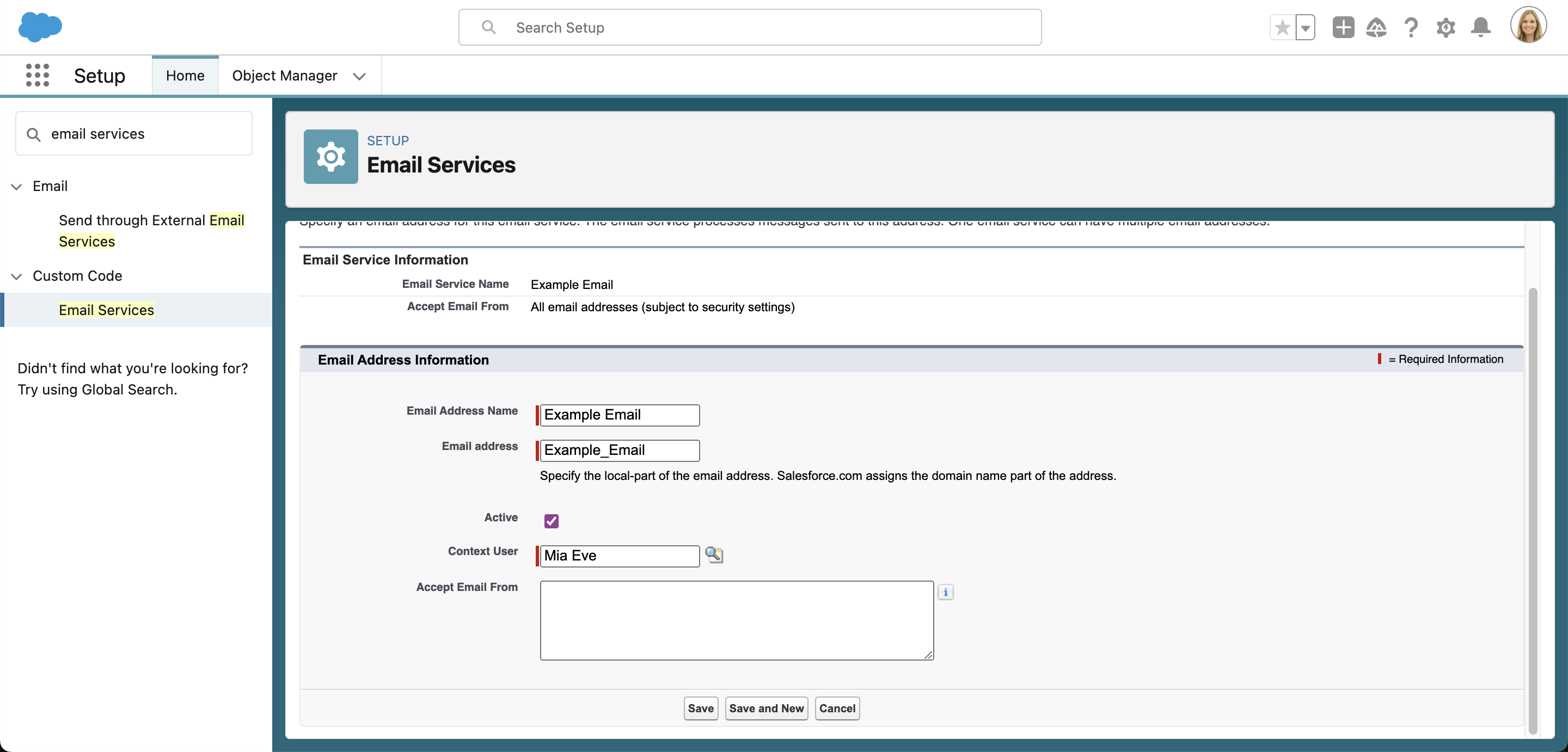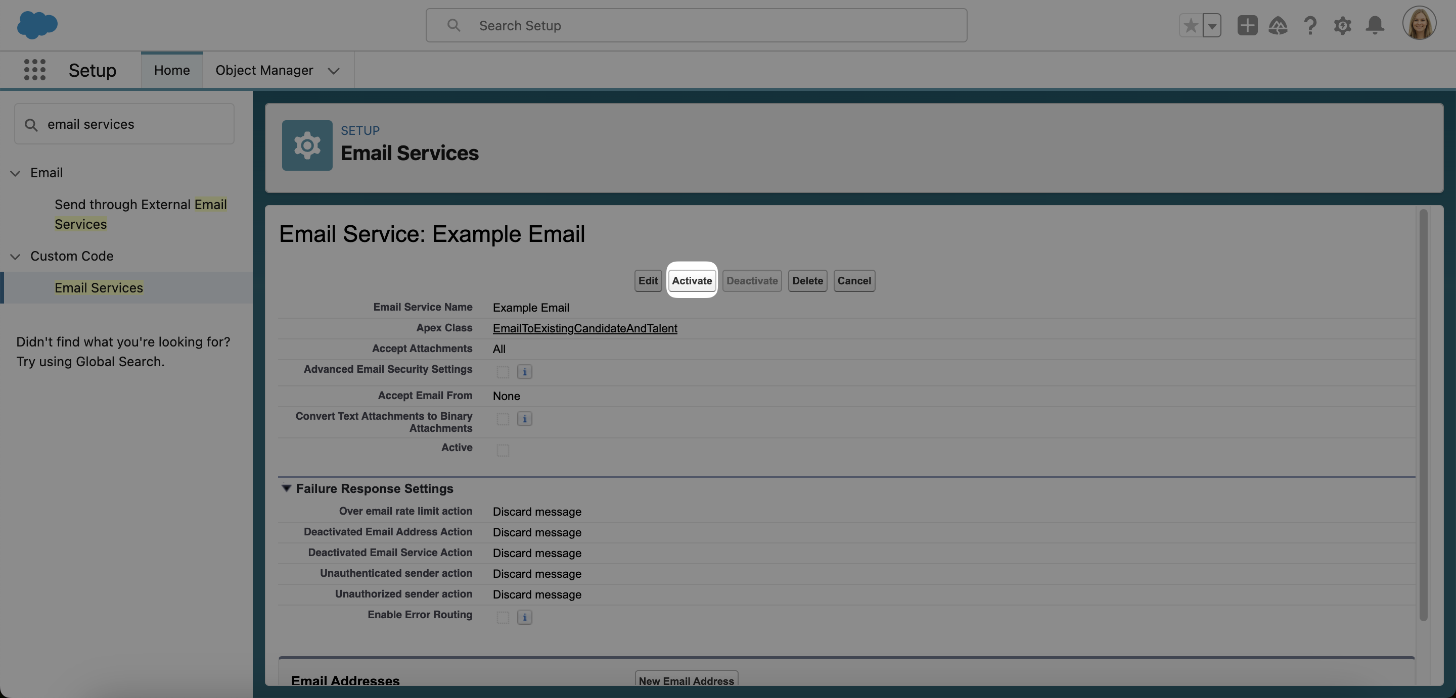 Gehen Sie zum Salesforce Setup und geben Sie Email Services in die Schnellsuche-Leiste ein. Klicken Sie auf New Email Service.
