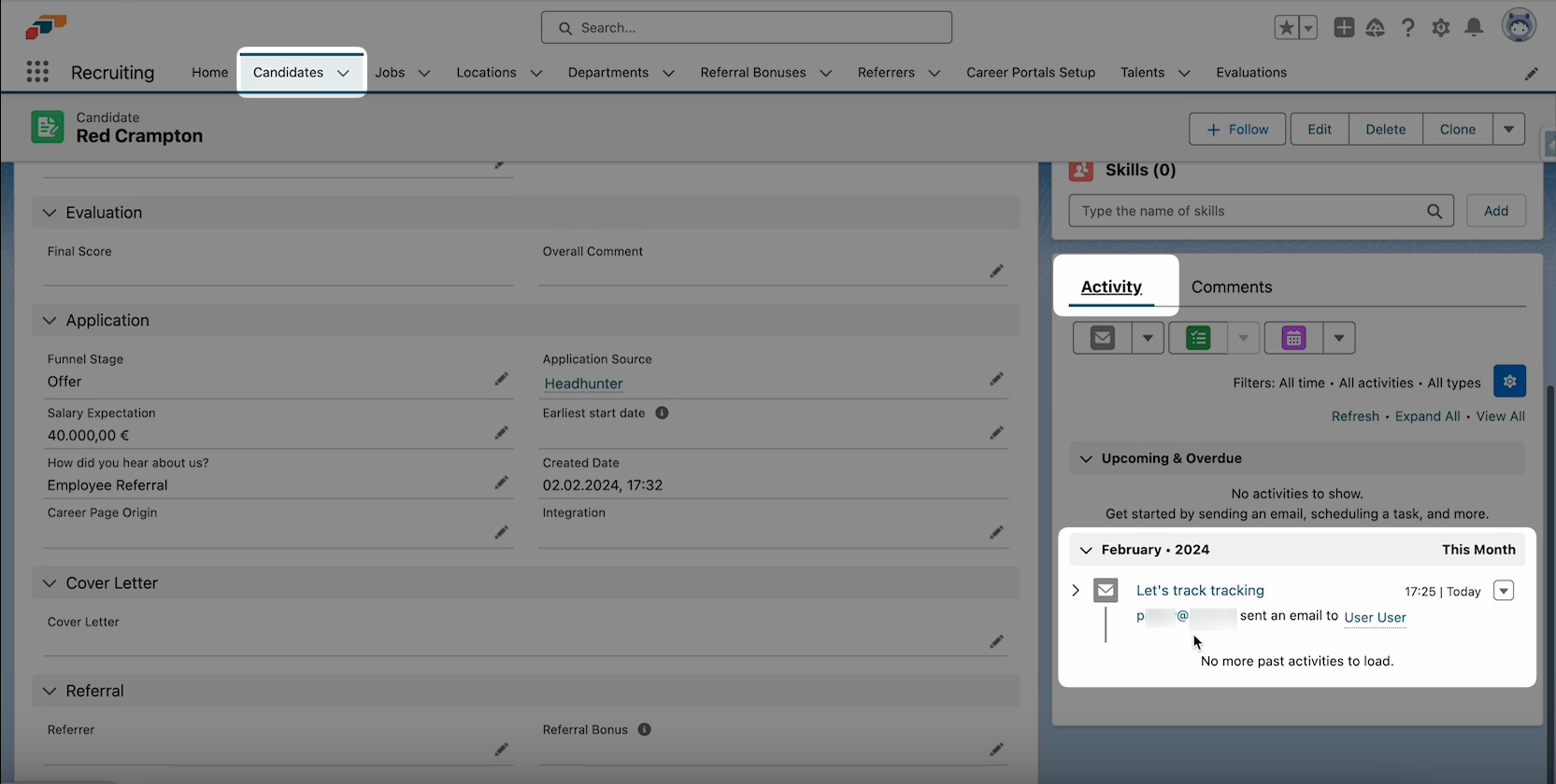 Sie können auch an den Kandidaten gesendete E-Mails verfolgen. Verwenden Sie dazu die E-Mail-Adresse, die Sie Ihrem E-Mail-Dienst hinzugefügt haben, und fügen Sie sie in BCC hinzu, wenn Sie E-Mails an Kandidaten senden. Ihre gesendete E-Mail erscheint dann ebenfalls im Abschnitt Activity des Kandidatendatensatzes.