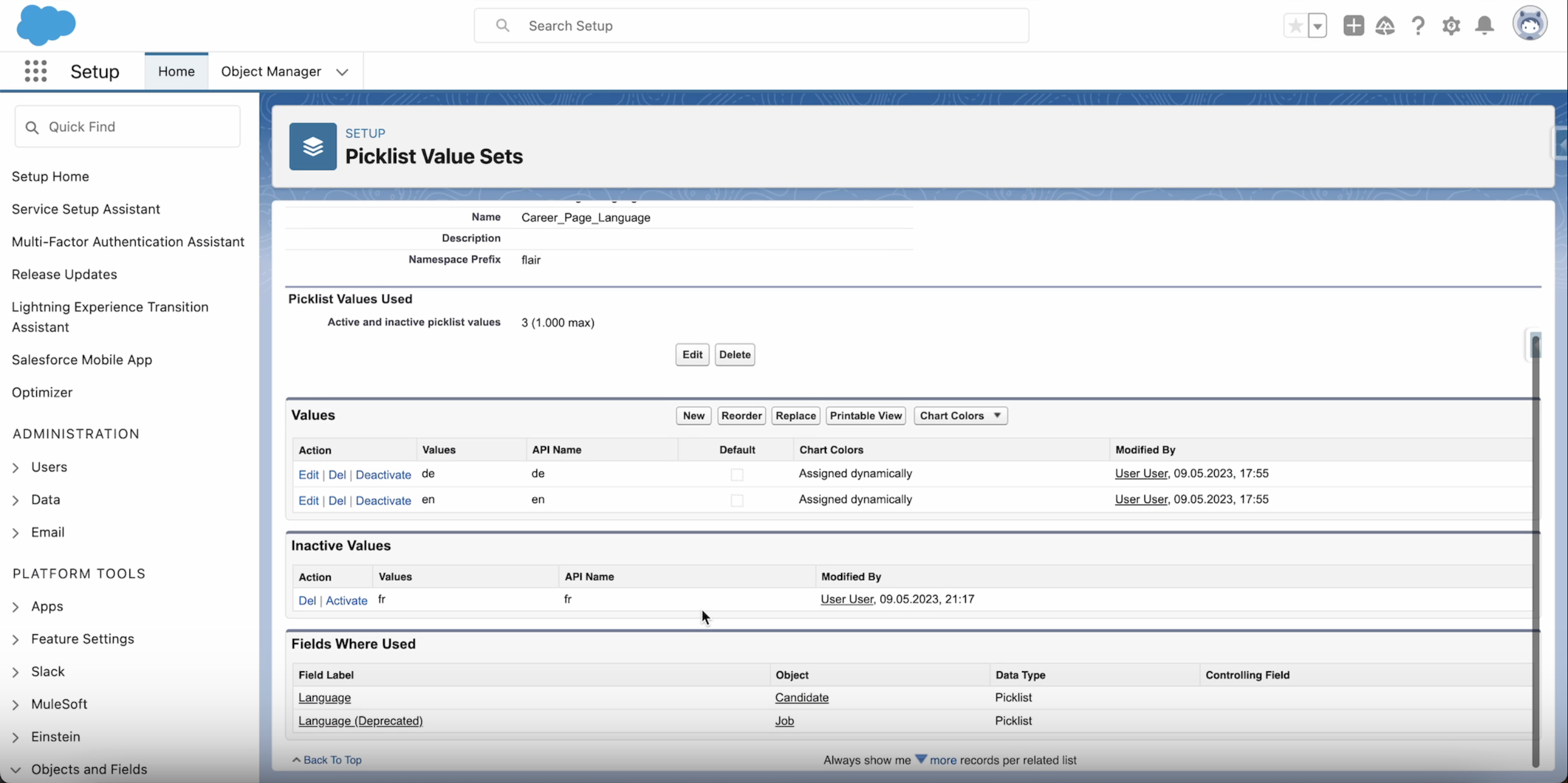 Now if we scroll down to Values, we can see that fr is listed in the Inactive Values, meaning French is no longer a valid language for selection in this particular picklist.