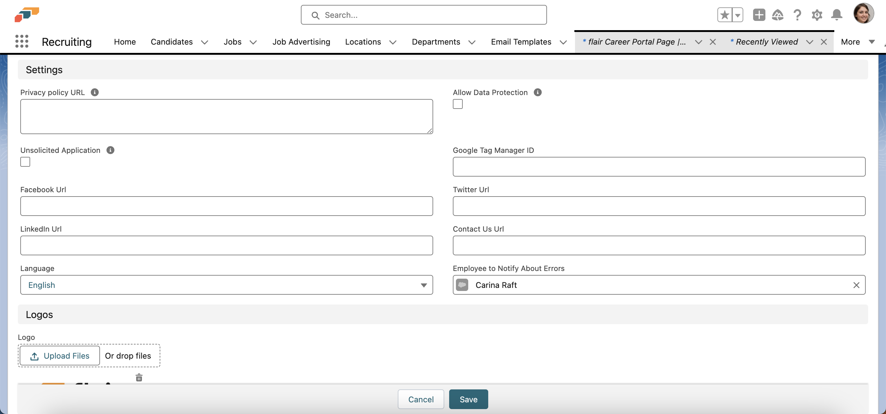 First of all, decide on a person who should receive a notification in case there is an application error. By default, your integration user will receive these notifications. To change this, open the Career Portal Setup page in flair Recruiting and select the Details tab. Scroll down to the Settings section and click on the Employee to Notify About Errors. Select a user from the picklist and this person will receive an email if there is an error with a job application on this career portal.