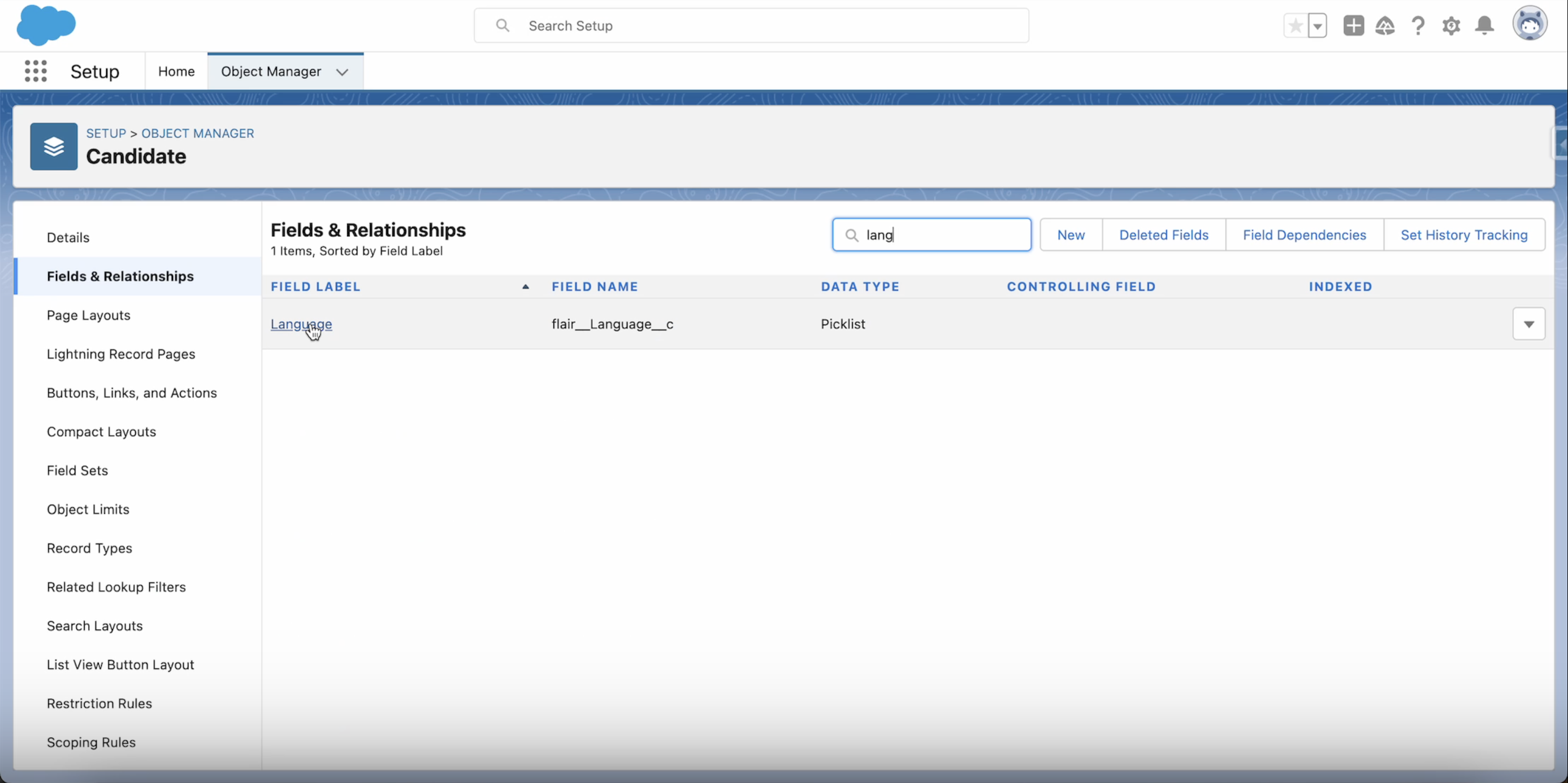 To solve this error, go to Salesforce Setup and open the Object Manager. Click on the Candidate object and select the Fields & Relationships tab on the left. As the error message in this example tells us the field affected was flair__Language__C, that’s the field we’ll select.