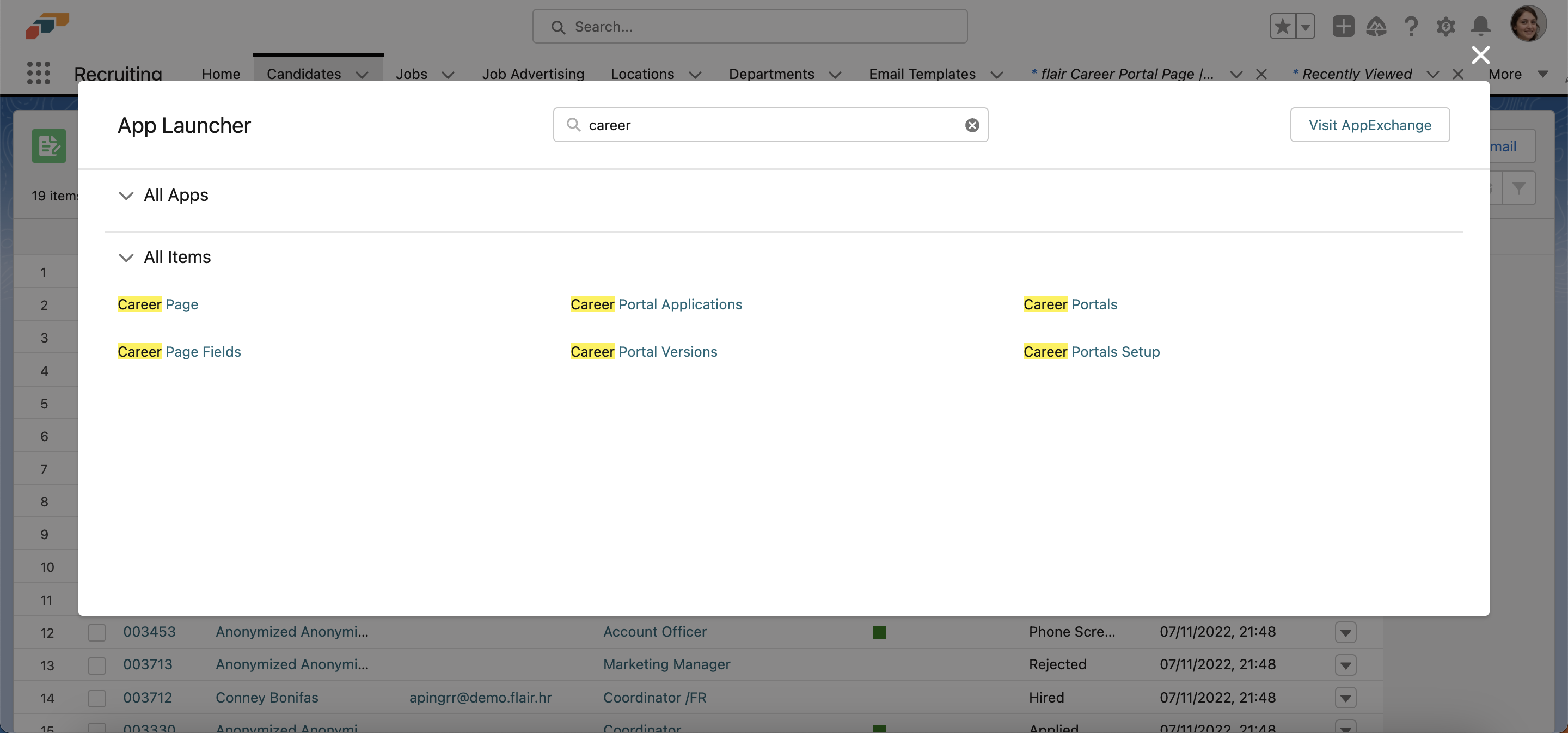You can view all job applications by selecting Career Portal Applications from the Salesforce App Launcher.