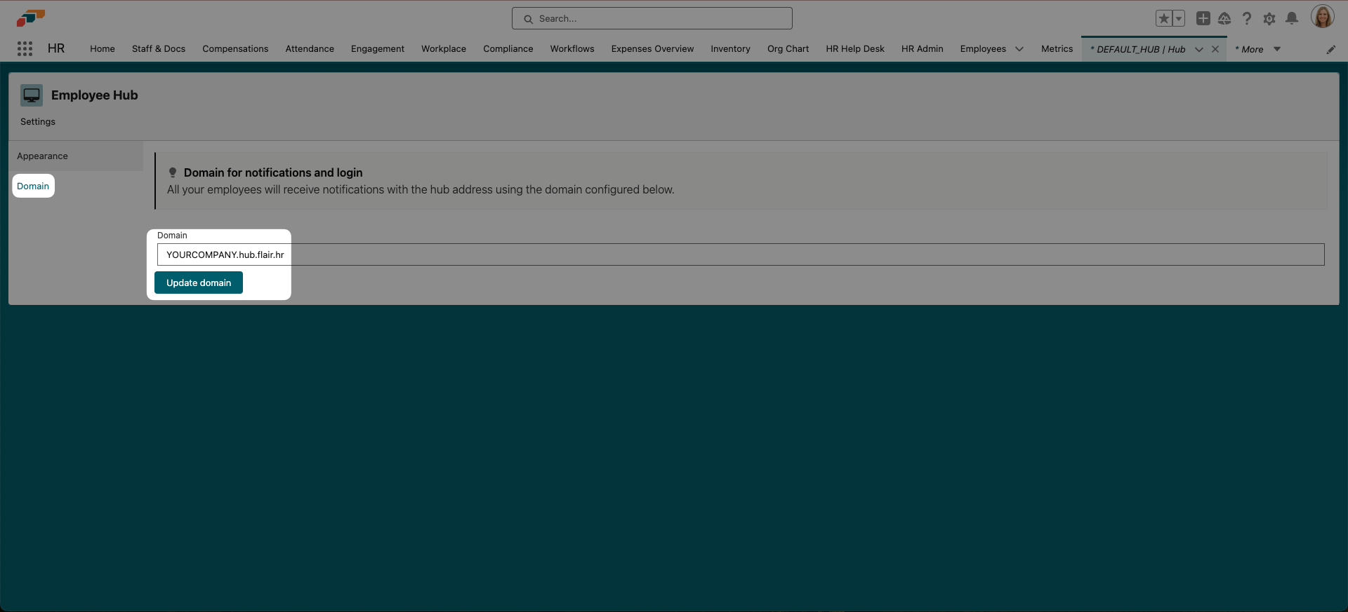 YOURCOMPANY.hub.flair.hrThen click Update Domain.