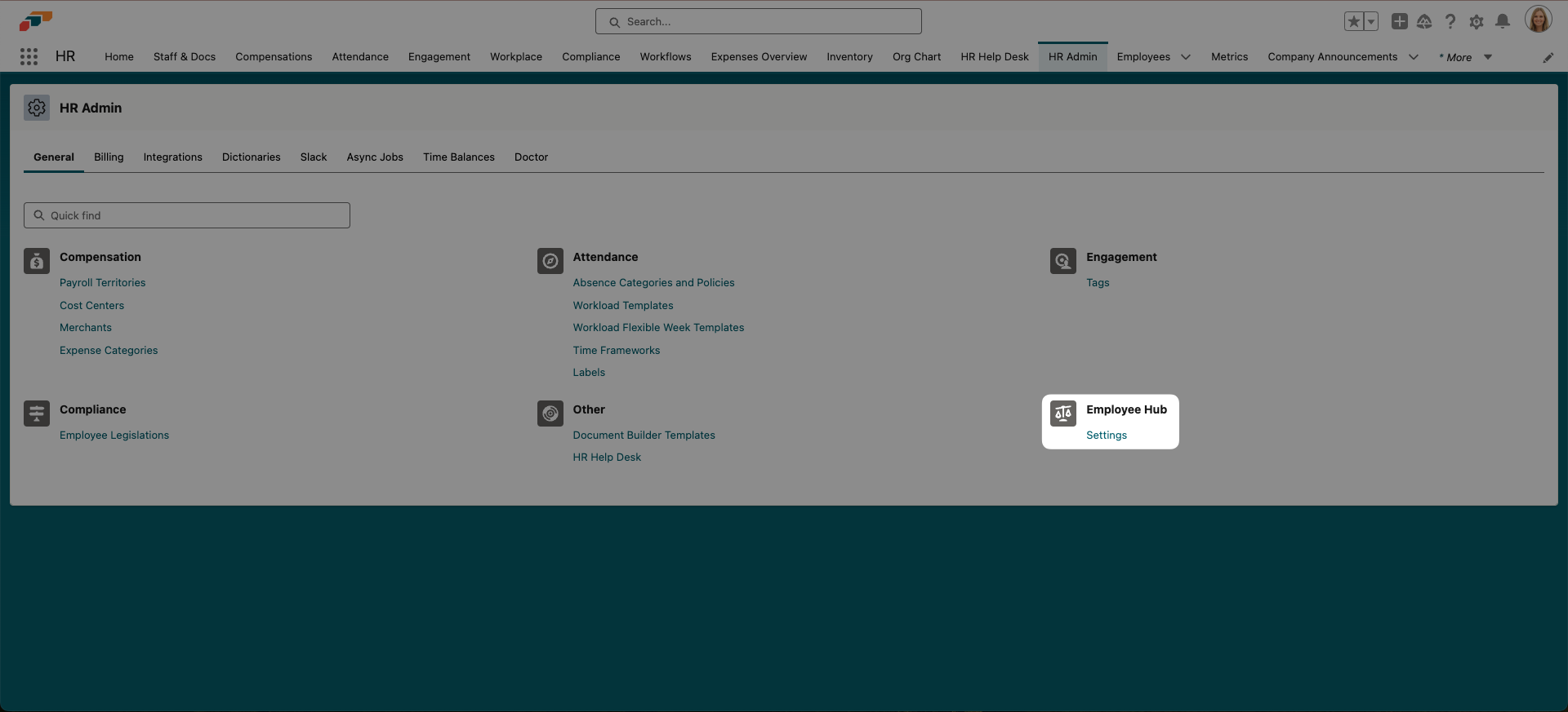- Click on Settings in the Employee Hub section.