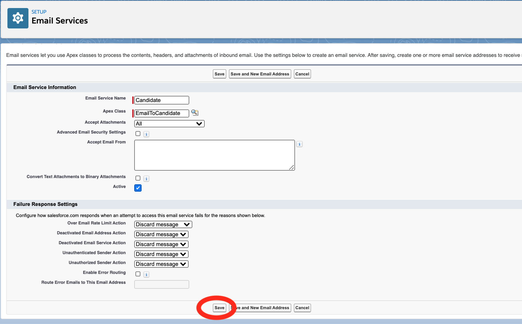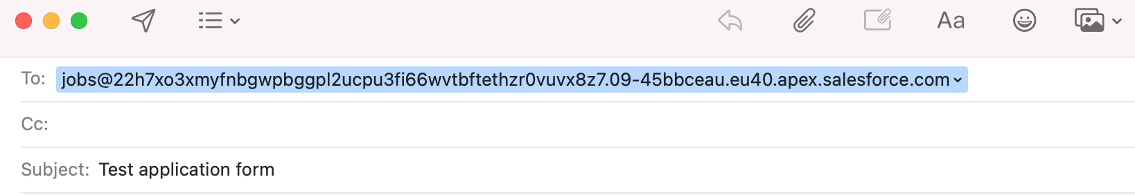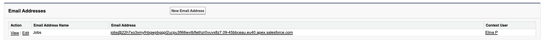 Define your email address by filling in the Email Addressfield. The word you enter here will appear before the @ symbol in the email address. For example, if you type ‘jobs’, the email address will start with jobs@. The part of the email address after the @ symbol will be automatically generated by Salesforce.