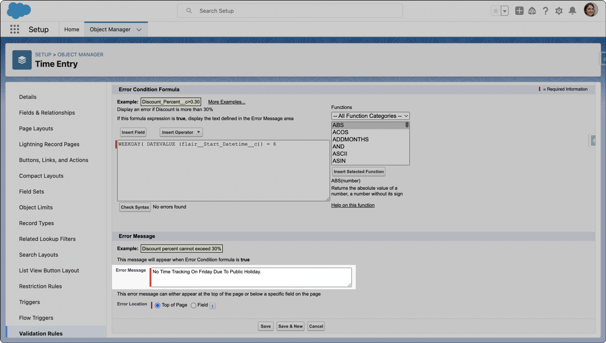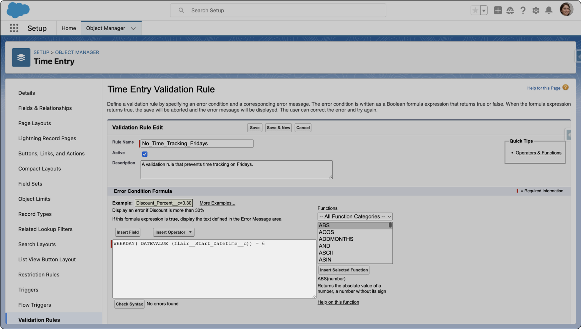 • Next click New. To set your new validation rule to prevent time tracking on a certain day, you will need a formula. The formula is: WEEKDAY( DATEVALUE (flairStart_Datetimec)) = 6