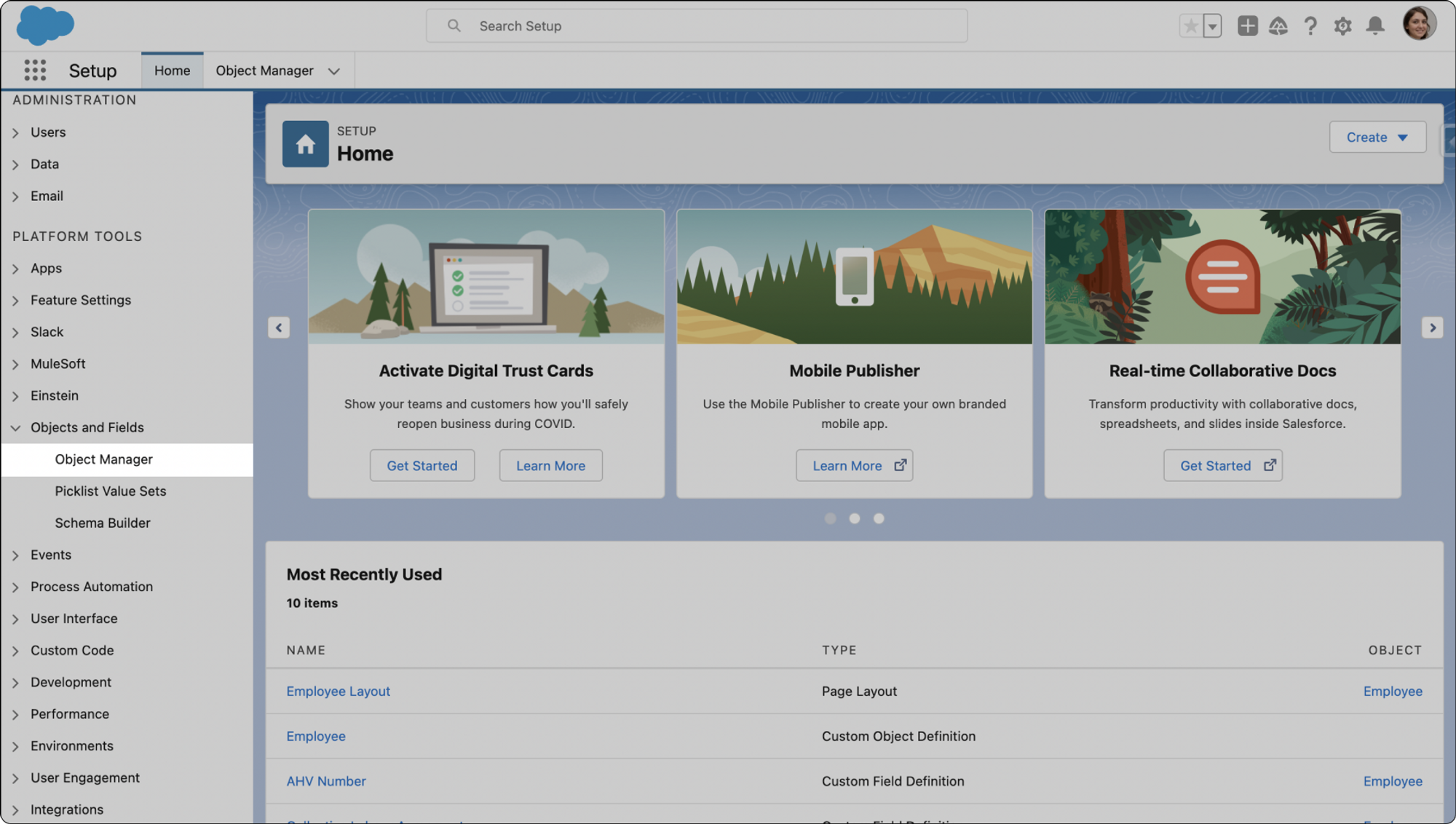 • Next, in the left-hand panel, under Platform Tools, select Object Manager in the Object and Fields drop-down menu.