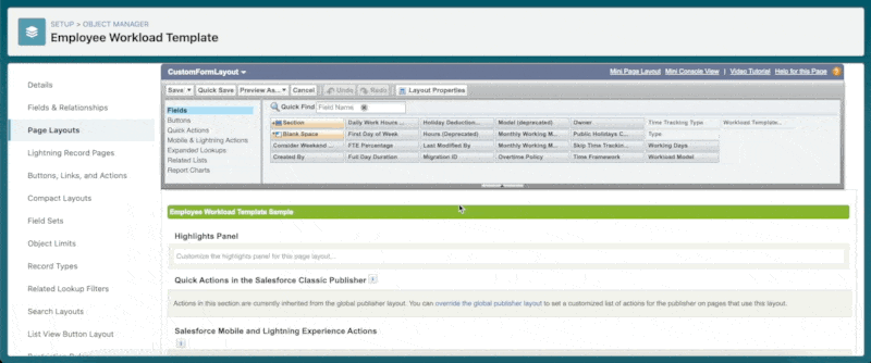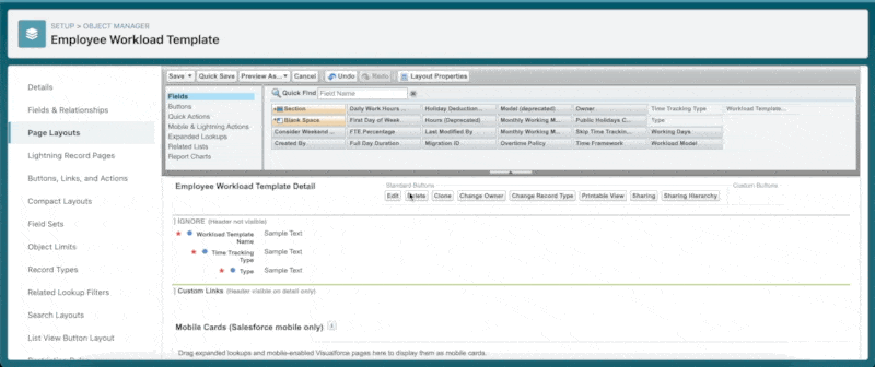 1. Scroll down to Employee Workload Template Detail. You will see a section named Fields (Header Not Visible). Click the wrench icon 🔧 to the right of this and change the Section Name to IGNORE.