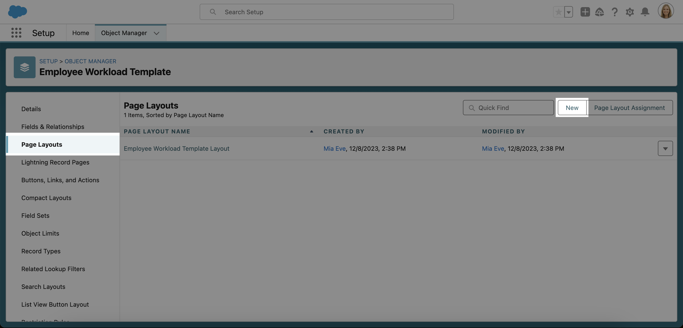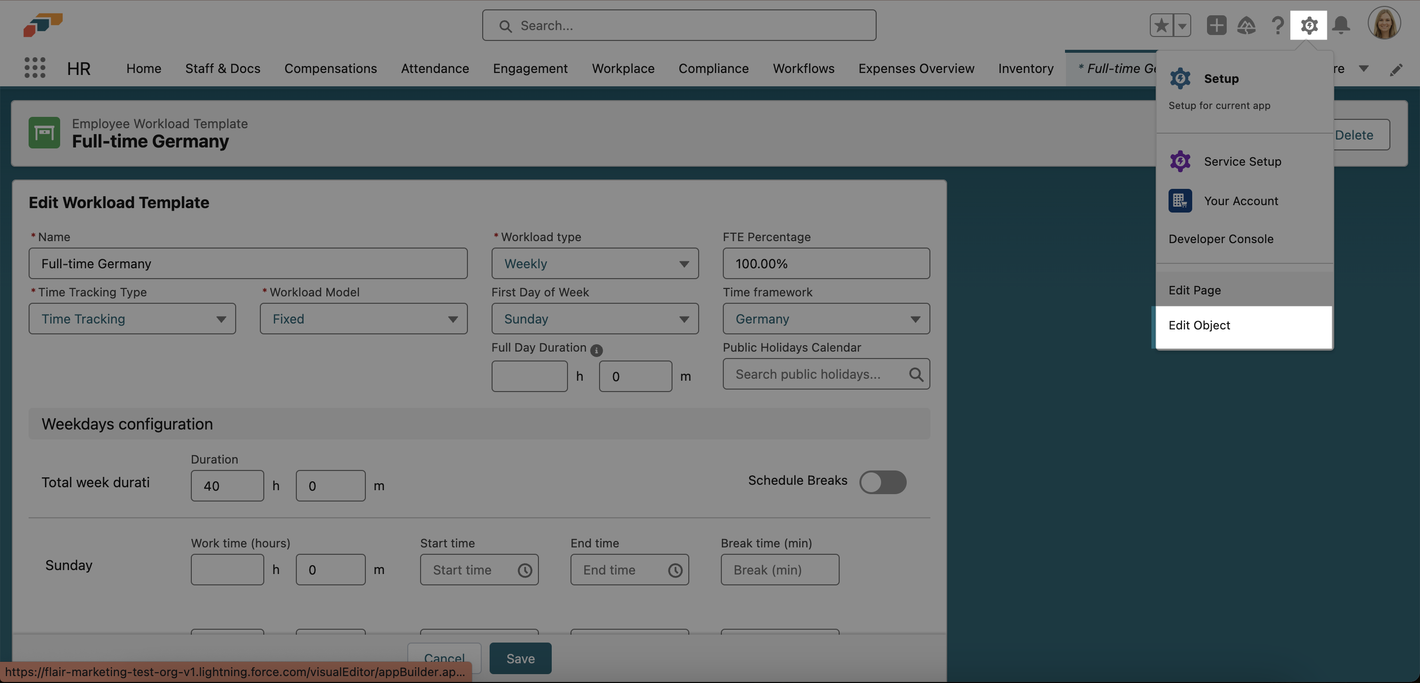 2. Click on the workload template you wish to modify. Now click the gear icon ⚙ and select Edit Object. This will open a new tab in the Salesforce Setup Object Manager.