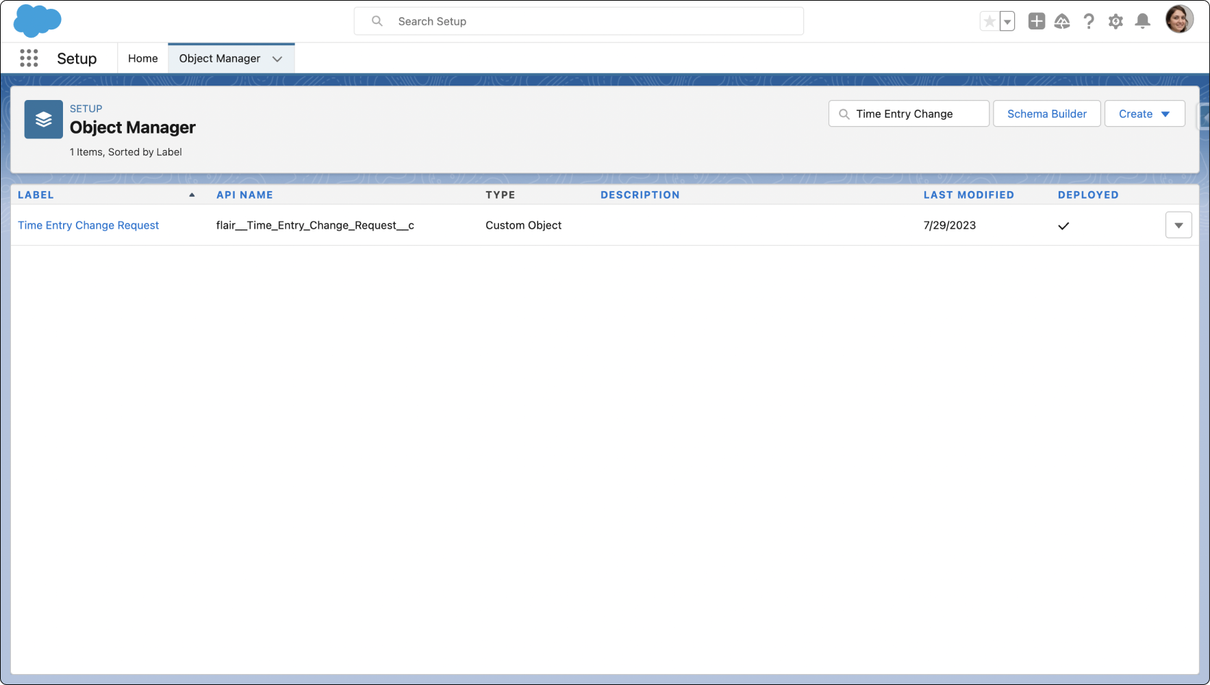 • In the Object Manager, locate and click on the Time Entry object. You can use the Quick Find search box.